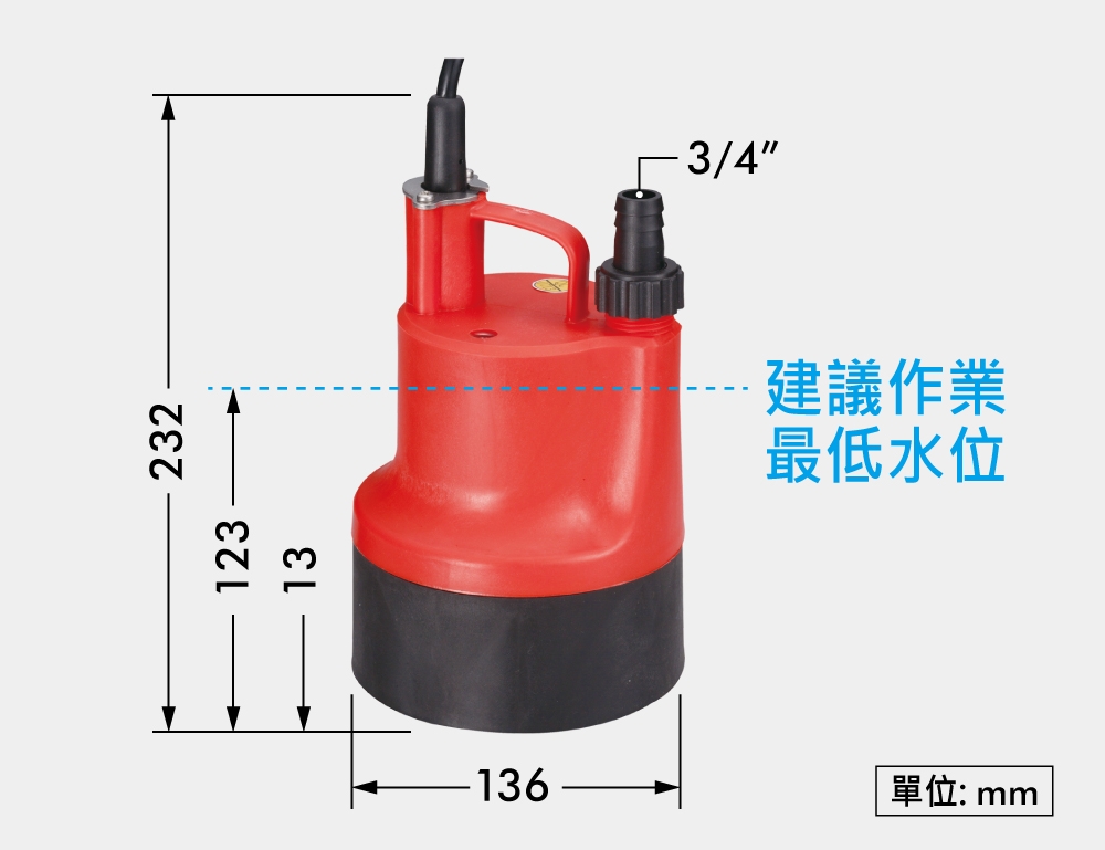 ※ 請勿長時間低於建議水位作業,容易造成馬達過熱