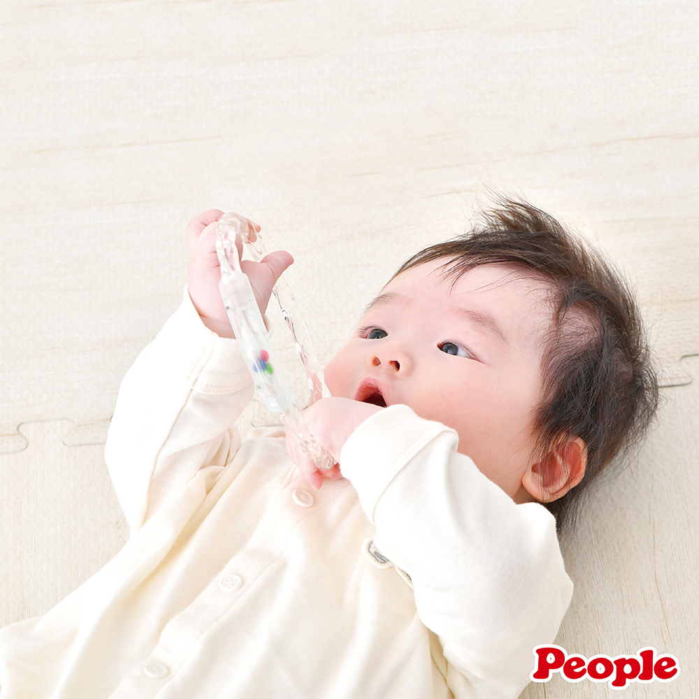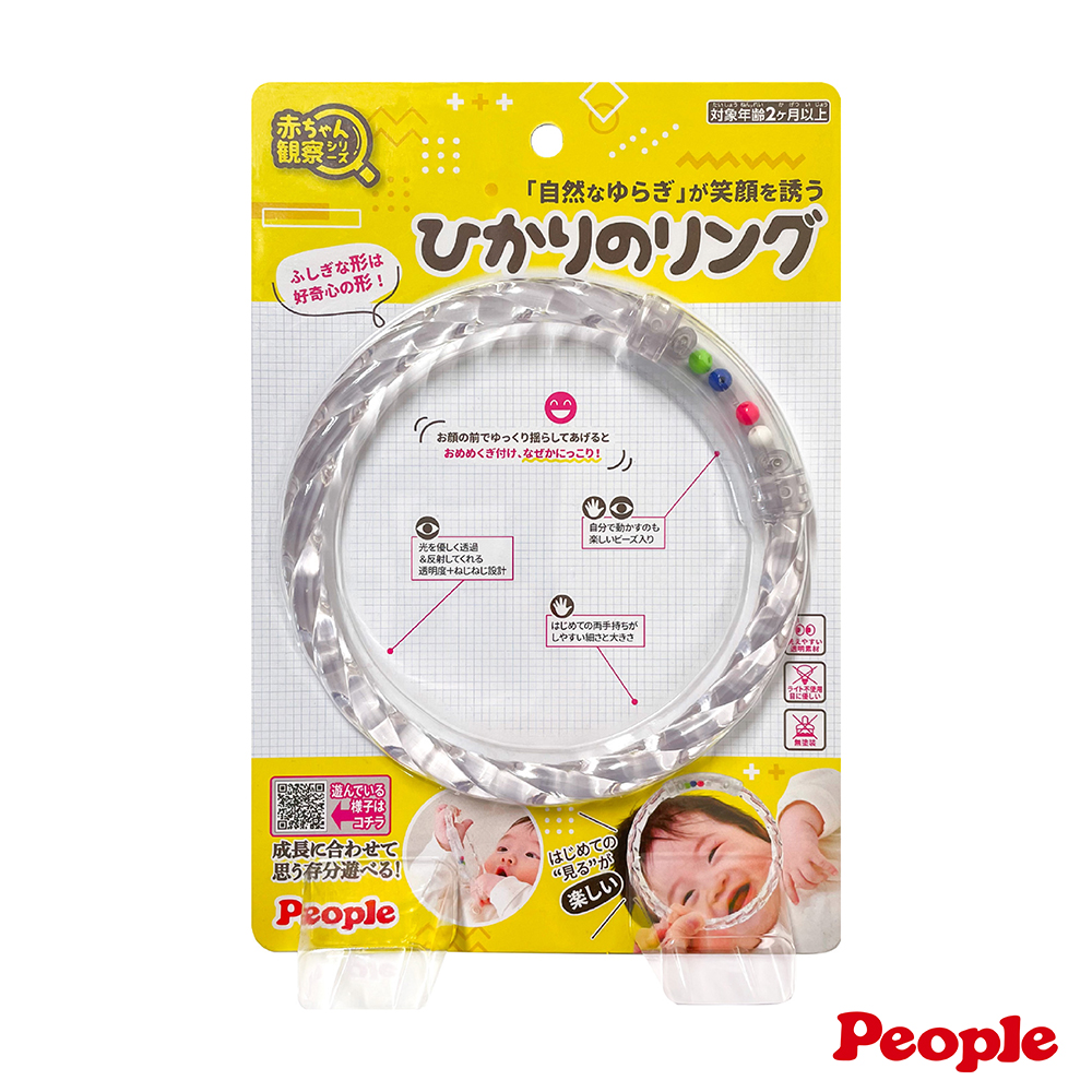 我們注意到剛出生不久的寶寶的視線會看向有亮光的地方,就是設計的契機。比起鮮豔的顏色,寶寶對光的明暗及對比更有反應。因此我們研究了能溫和反射光線的透明材質,以及更能吸引光線的扭轉形狀,這是讓寶寶體驗『看見的感覺真有趣』的第一個玩具喔!