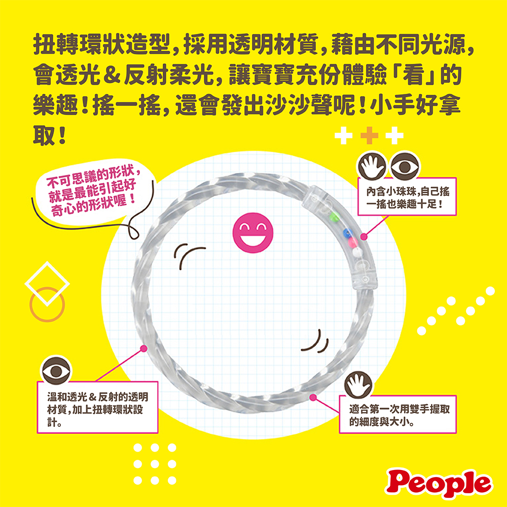扭轉環狀造型,採用透明材質,藉由不同光源,會透光&反射柔光,讓寶寶充份體驗『看』的樂趣!搖一搖,還會發出沙沙聲呢!小手好拿取,單手玩或雙手玩都能玩得很開心!不含塗料,安心玩耍! 本體尺寸:直徑約13cm