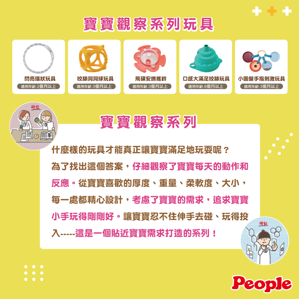 什麼樣的玩具才能真正讓寶寶滿足地玩耍呢?為了找出這個答案,仔細觀察了寶寶每天的動作和反應。從寶寶喜歡的厚度、重量、柔軟度、大小,每一處都精心設計,追求寶寶小手玩得剛剛好。讓寶寶忍不住伸手去碰、玩得投入-----這是一個貼近寶寶需求打造的系列!