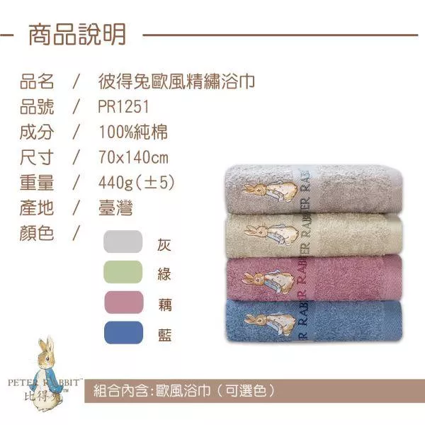 【PETER RABBIT】 比得兔純棉高支紗歐洲色系浴巾PR1251