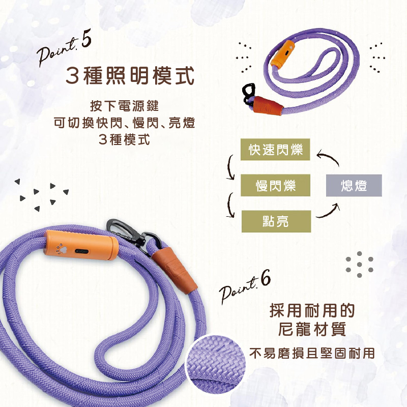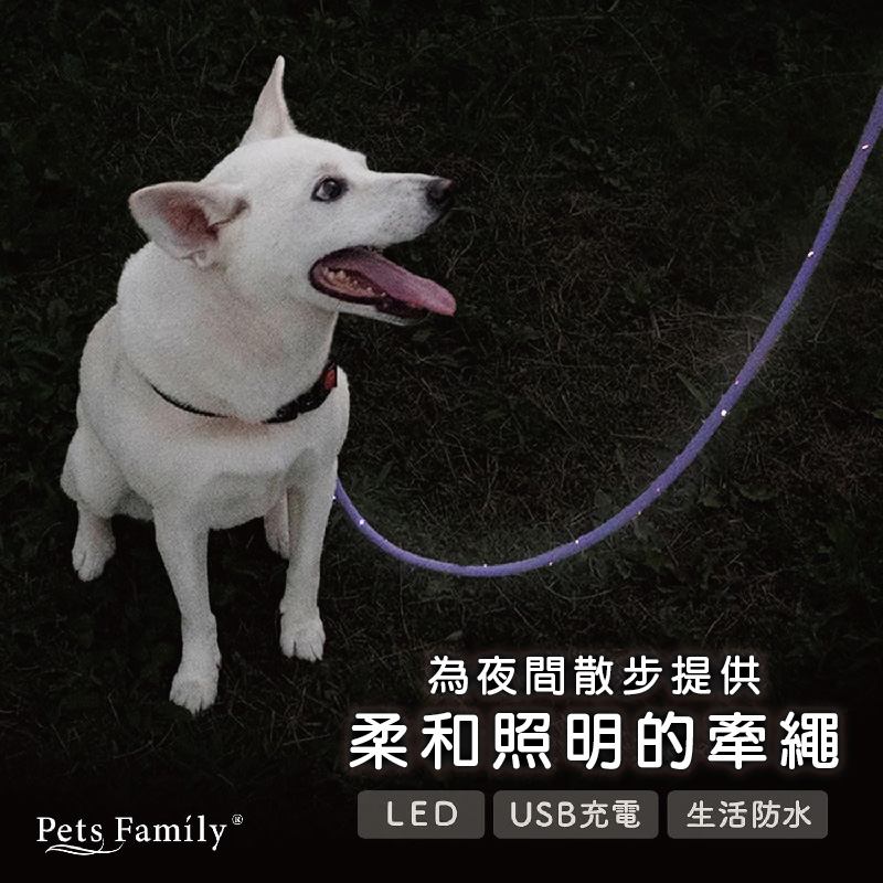 🐶 反光條設計更提升安全性除了 LED 光源外,牽繩本身反光條在車燈照射下也更顯眼,雙重防護更放心。