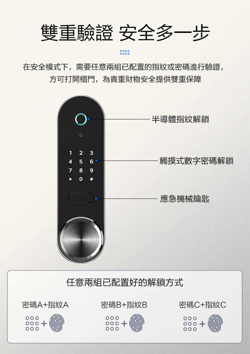 【商品特色】指紋、密碼、機械鑰匙多種開鎖雙重驗證安全模式一體成型低碳合金工藝鑄造多重警報、全天守護半導體指紋模組超纖皮革內飾【商品規格】基本參數主要材質:低碳合金表面工藝:噴塗顏色:淡雅藍產品尺寸:780x480x470 mm商品重量:106kg開鎖方式 指紋容量:30組密碼容量:10組鑰匙 2把電源供電電源:4顆3號鹼性電池工作電壓:4.5-6V電池壽命:6-12個月應急供電:外接接口靜態電流:≤80uA動態電流:≤300mA警報功能警報方式:低電量警報/震動警報/錯誤警報狀態指示燈 藍/綠/紅燈:正常使用中/識別成功/識別失敗紅燈閃爍:表示電壓不足或者異常警告系統系統解鎖模式:一般模式/安全模式系統語言:中文、英文廠商代號:XR責任代號:QMW