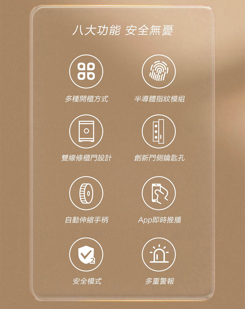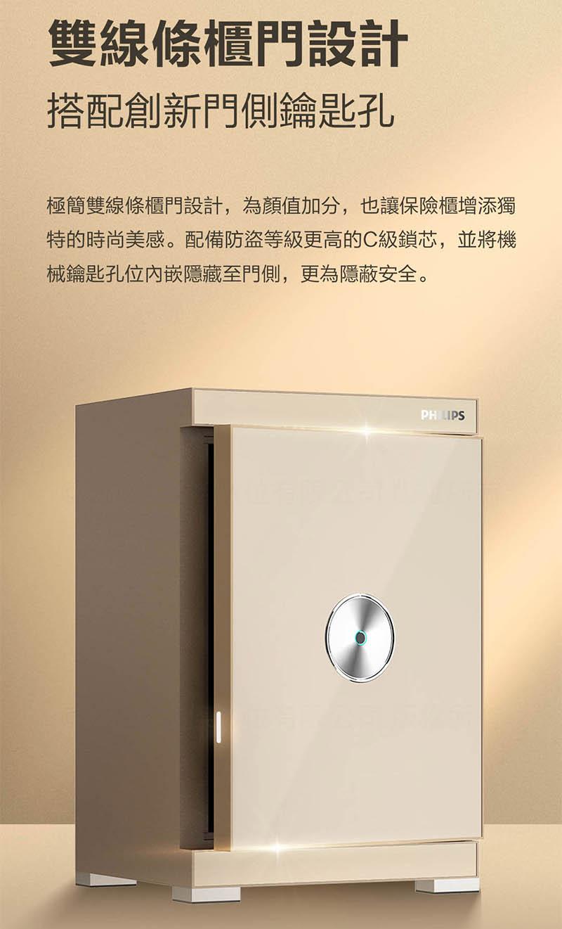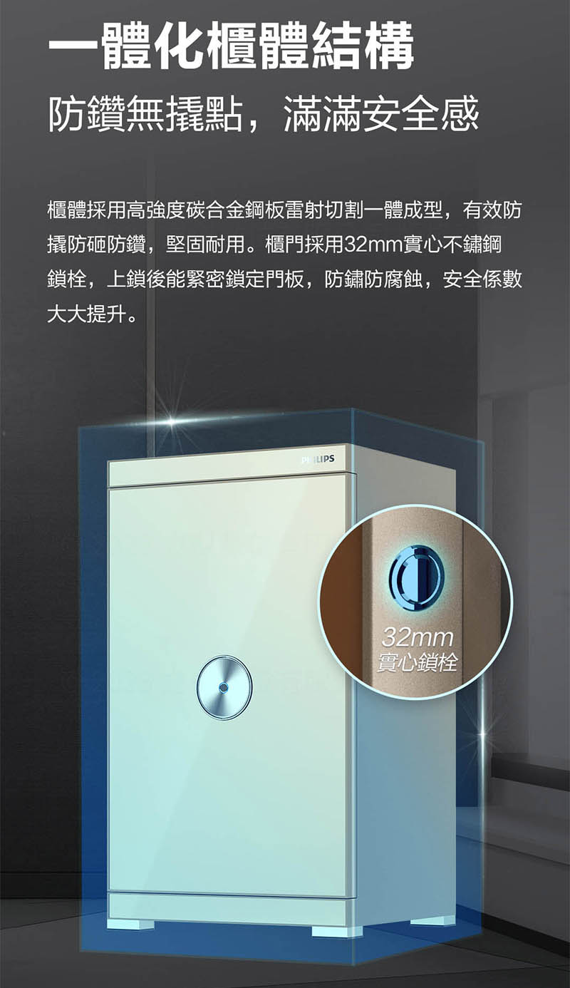 【商品特色】飛利浦保險櫃SBX602應運而生,在擁有美感的同時又賦予了滿滿科技感,打破傳統保險櫃的限制,讓消費者感受到不一樣的智慧安防體驗!指紋、密碼、機械鑰匙多種開鎖雙重驗證安全模式隱藏式內嵌手柄多重警報、全天守護半導體指紋模組【商品規格】基本參數主要材質:低碳合金鋼箱體:靜電噴塑門體:磨砂鍍膜顏色:淺霞金產品尺寸:550x400x360mm商品重量:70.5kg開鎖方式 指紋容量:30組密碼容量:10組鑰匙 2把電源供電電源:4顆3號鹼性電池工作電壓:4.5-6V電池壽命:6-12個月應急供電:外接接口警報功能低電量警報 / 震動警報 / 錯誤警報 / 箱門未關警報狀態指示燈 藍/綠/紅燈:正常使用中/識別成功/識別失敗系統系統解鎖模式:一般模式/安全模式系統語言:中文、英文廠商代號:XR責任代號:QMW