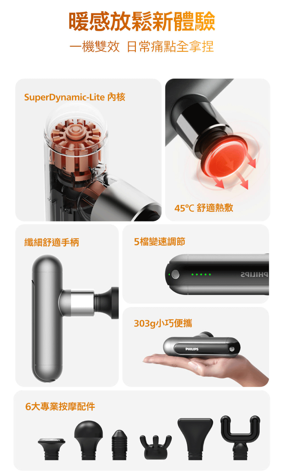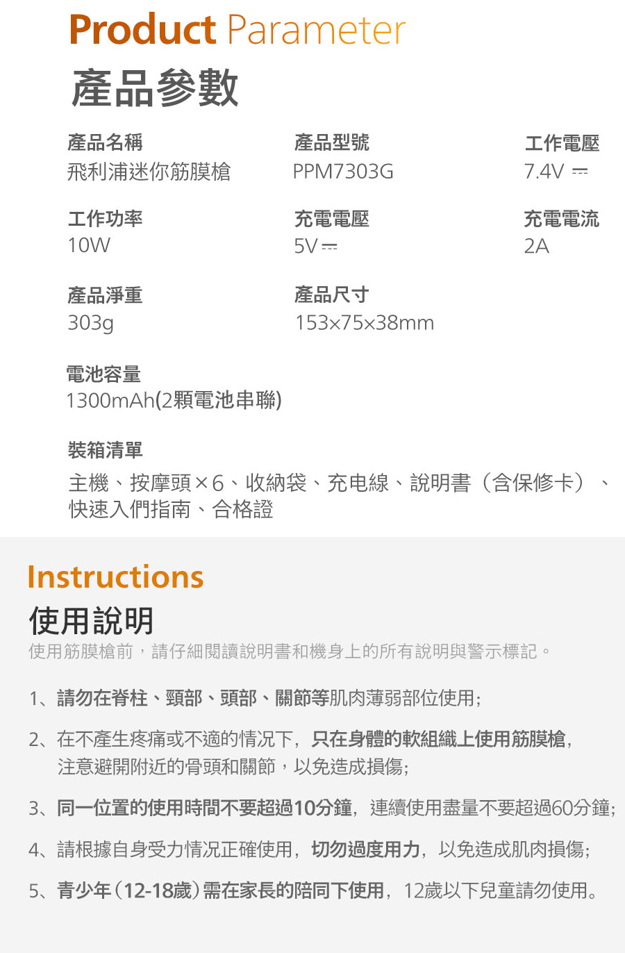 產品型號:PPM7303工作功率:10W按摩頭數量:6個檔位:5檔電池容量:1300mAh淨重:303g充電電壓:5V充電電流:2A商品尺寸:153*75*38mm商檢字號:R3A020