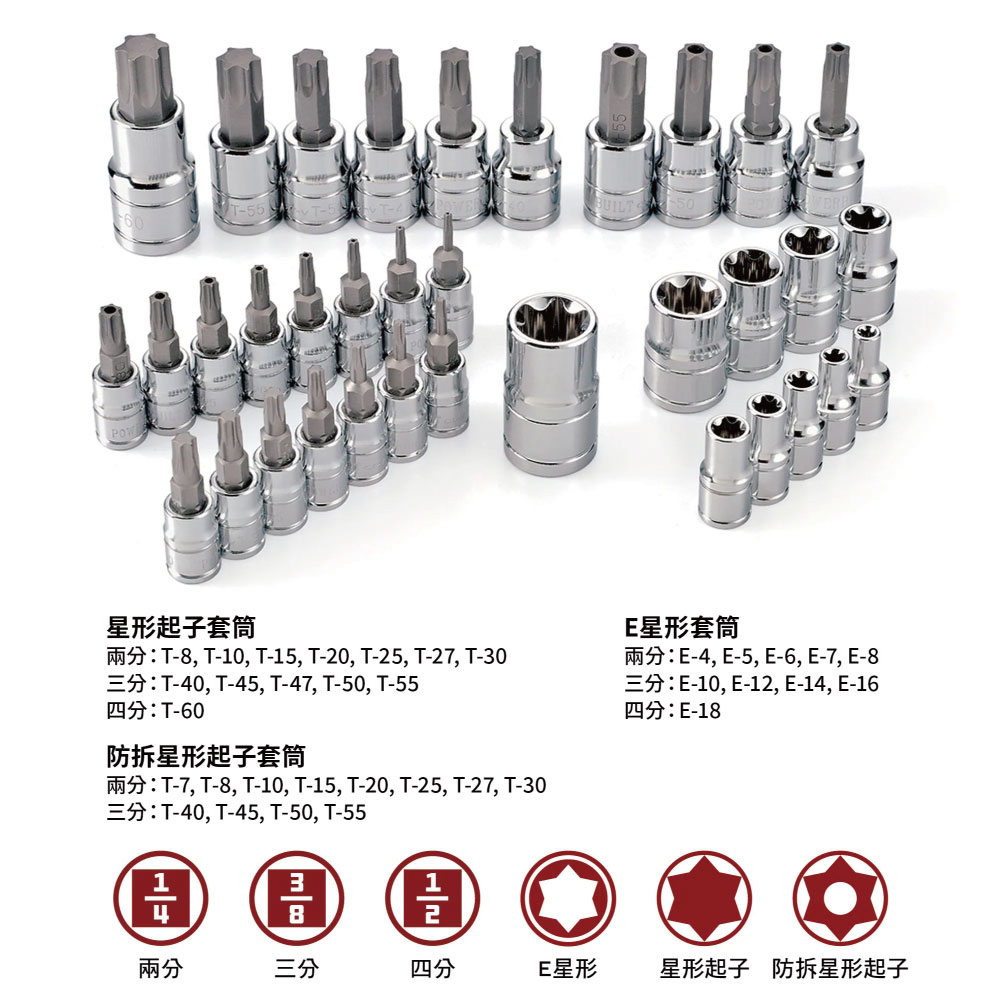 全面套裝設計:35件組合涵蓋常用的星型(Torx)、中空星型(Tamper Proof Torx)與E型梅花(E-Torx)套筒,滿足汽車維修、工業維護及日常機械作業需求。