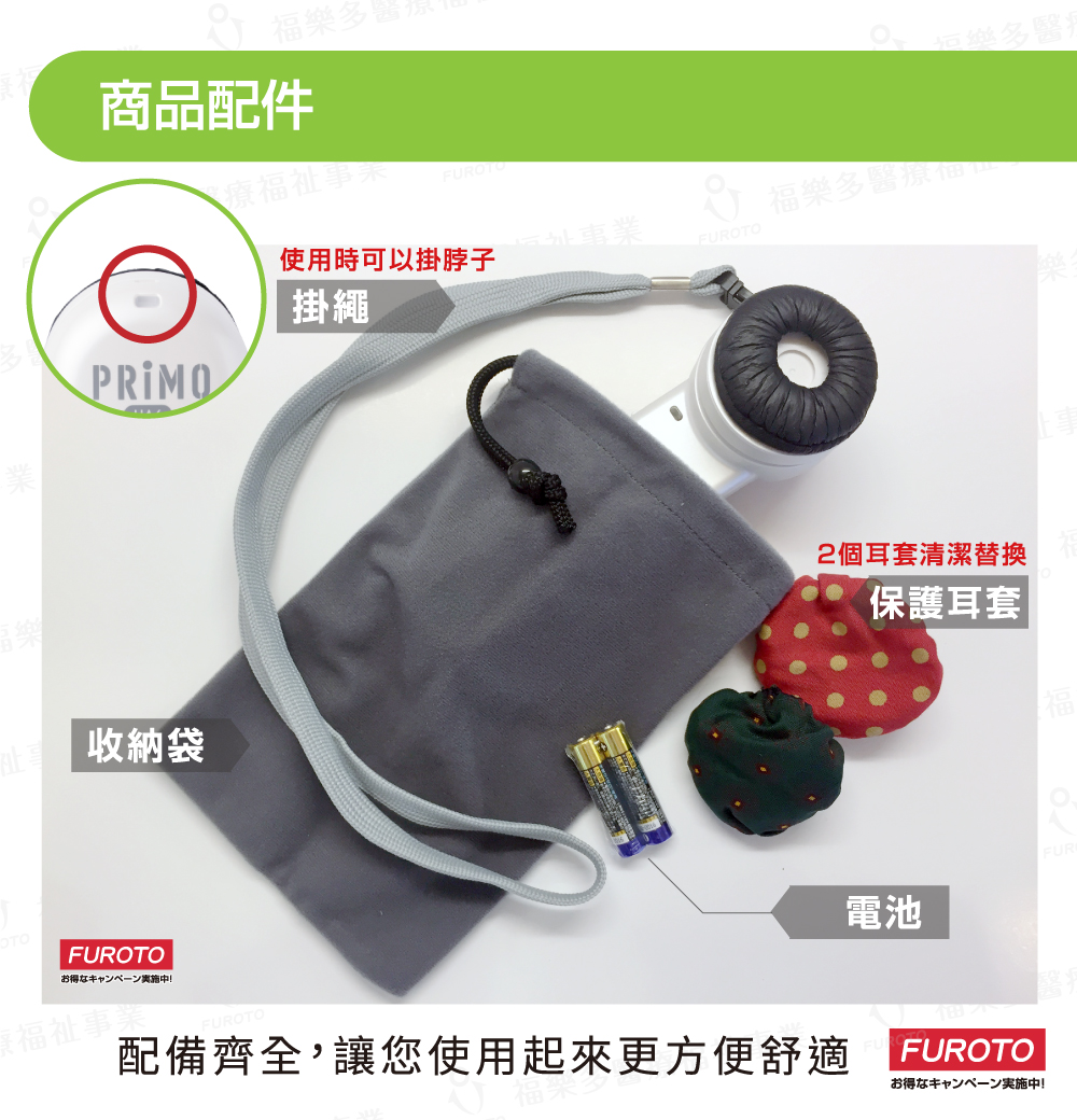 配件:說明書、保固書、原廠電池 x 2、收納袋 x 1/福樂多配件:掛繩 x 1、耳套 x 2