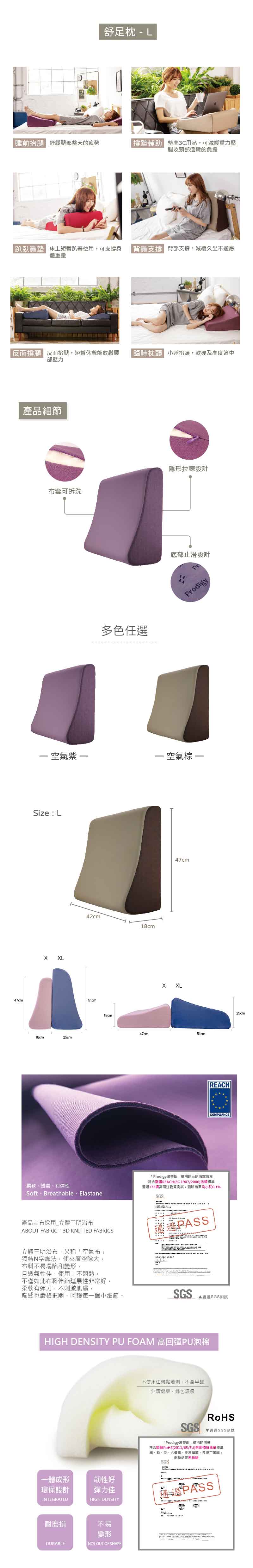 ▲嚴選優質三明治布作為表面層,高彈柔順,不易鬆垮▲布套可手洗、機洗方便清理▲符合人體工學,膝窩處開始的地方,是抬腿最適合的方式▲可長時間使用,微高於心臟的高度,可長時間抬腿,達到舒緩之效果▲一枕多用,可做為足枕、靠枕、趴讀枕、臥靠枕、躺睡枕、孕墊枕等用途【尺寸】47*42.5*18 cm【材質】聚酯纖維90%、彈性纖維10%、聚氨酯100%【產地】台灣【注意事項】1.產品顏色依實體為主。2.請避免潮濕 / 浸水 / 火源 / 利刃 / 高溫 / 日曬。3.請勿堆壓重物 / 避免不當拉扯或擠壓 / 避免沾染化學藥劑或揮發性溶劑。4.正常使用情況下布套建議定期清洗或擦拭,建議深淺色分開來洗滌。5.枕心正常使用下無須清洗,若有飲料等液體不慎流入可以清水沖洗後自然風乾即可,勿置於陽光下曝曬以免氧化影響使用壽命。【布套洗滌/拆裝教學】1.拆卸時,請將拉鍊拉開後,將布套由內向外,邊捲邊脫,可避免因不當拉扯而損壞布套或枕心。2.丟入機洗時,請放入洗衣袋中清洗,或手洗方式皆可。3.套裝時,請將布套由上向下套入枕心,對準側面位置邊捲邊穿上。(請注意!布套的剪裁有曲線及平面之分別,以免裝錯要拆除重裝)4.布套裝上後,請將一手伸入布套內按壓枕心,另一手在布套外面,調整枕心及布套的位置,使布套和枕心的邊緣對齊,最後再拉上拉鍊,即可恢復正常使用狀態。