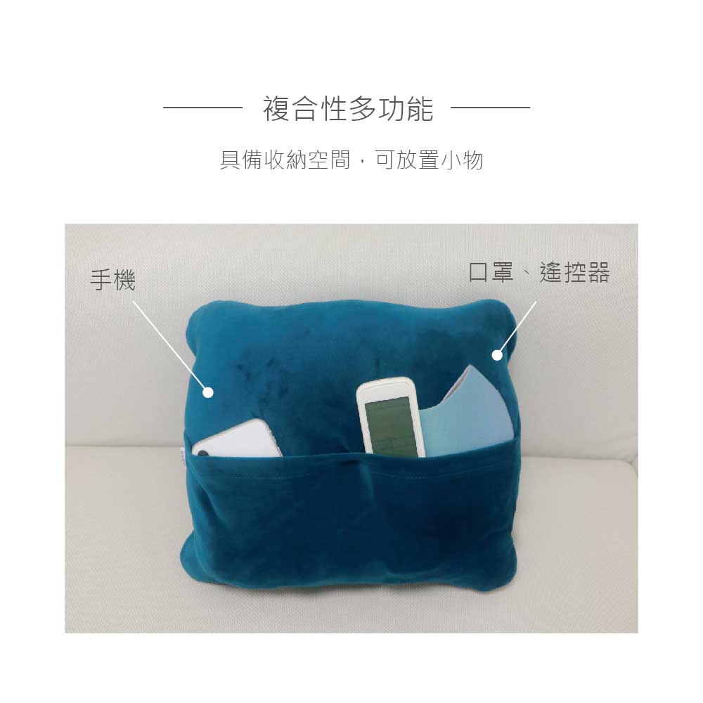 超彈力多功能用枕 隨身攜帶好便利▲一枕多用途,可暖手、趴睡、腰靠、躺睡、抱枕等▲具有收納空間設計,可放置物品不佔空間▲絨短毛布料作為表面層,柔順親膚不掉毛▲使用A棉蓬鬆彈性佳,可機清洗【尺寸/重量】32*13*27cm(±1cm)/344g(±10g)【材質】聚酯纖維、A級棉【產地】台灣 【注意事項】① 產品顏色因每台電腦螢幕的不同,請依實際顏色為主② 正常使用情況下布套建議定期清洗或擦拭,並且深淺色分開來洗滌③ 請避免潮濕 / 浸水 / 火源 / 利刃 / 高溫 / 日曬④ 請勿堆壓重物 / 避免不當拉扯或擠壓 / 避免沾染化學藥劑或揮發性溶劑⑤ 枕芯正常使用下無須清洗,若有飲料等液體不慎流入可以清水沖洗後自然風乾即可,勿置於陽光下曝曬以免氧化影響使用壽命