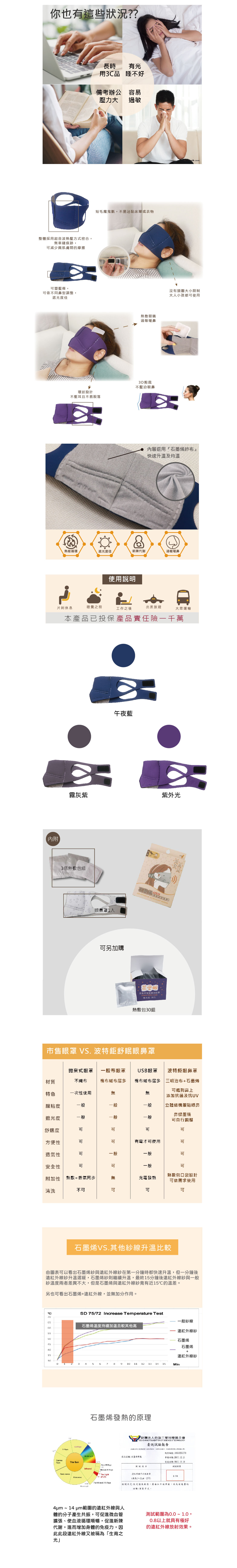 "眼罩+熱敷+遮光+鼻罩 四合一 舒緩放鬆疲勞"※ 眼睛疲勞、睡眠不佳、想減少冷空氣直接接觸、遮光等需求皆宜※ 居家、旅遊、搭交通工具、出差等皆可方便攜帶使用※蒸氣熱敷效果 / 熱敷片免加熱、免插電,直接取出即可享用,具恆溫、控溫、受熱均勻等效果,攜帶方便且輕巧※可依個人鼻翼塑型,魔鬼氈設計依頭圍達到極佳鬆緊度※複合型機能特色/ 無使用蒸氣熱敷效果時,可作為一般眼罩所使用※布質柔軟且抗UV / 抵擋紫外線直射,減輕眼睛負擔,可清洗且環保※抗UV抵擋紫外線侵害及抗菌認證※石墨烯內裡,保暖蓄熱佳【尺寸/重量】11.5X28.5(±1cm)/84g(±10g)【材質】眼鼻罩-聚酯纖維100%內襯-聚酯纖維64.2%、石墨烯紗27.6%、彈性纖維8.2%發熱包-鐵粉、碳粉、精製鹽、蛭石、高吸水樹脂、水盒裝規格:1個眼鼻罩、3包鋁袋發熱包(每包2片)保存期限:3年(製造日期請詳見包裝)【產地】台灣