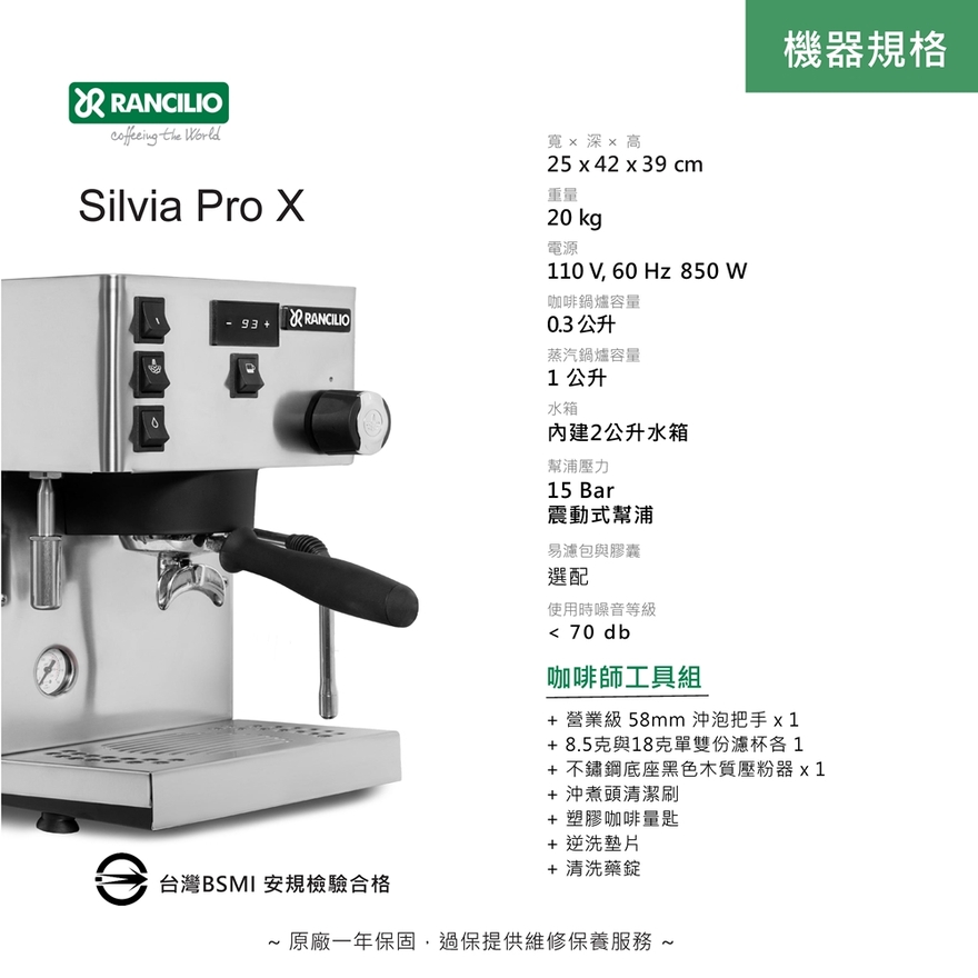 Rancilio Silvia Pro X 結合了經典家用機的耐用性與商業級功能,無論是 義式濃縮、拿鐵 或其他咖啡飲品,都能提供專業級體驗,是進階咖啡玩家值得投資的一款高端義式咖啡機。【主要特色】☕ 雙鍋爐設計 (Dual Boiler)0.3L 咖啡鍋爐 (黃銅材質) 負責萃取,提供穩定水溫1L 蒸氣鍋爐 (不鏽鋼材質) 獨立運作,可同時進行蒸氣發泡🌡 PID 精準溫控電子 PID 溫控系統,調整萃取溫度透過數位顯示器監控鍋爐溫度,確保穩定萃取🕘 可調式預浸泡 (Soft Pre-Infusion)提供軟性預浸泡,讓咖啡粉在萃取前先吸收熱水,提升均勻萃取效果💨 強大蒸氣動力1L 獨立蒸氣鍋爐,穩定提供強勁蒸氣專業級不鏽鋼蒸氣棒 (可 360° 旋轉) 打造細膩奶泡💧 即熱式熱水出口可直接取熱水,用於美式咖啡、茶或其他飲品📏 水箱與排水功能2L 可拆式水箱,方便補水與清潔可拆卸滴水盤,簡化維護與清潔流程
