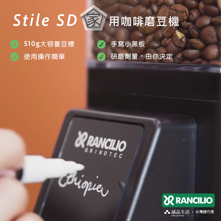 Rancilio Stile 是一款專為咖啡愛好者與營業店家 設計的小巧且功能強大的磨豆機,具備精確研磨與易於操作的特性。特別適合對咖啡品質有要求的個人用戶,同時也是咖啡店作為第二台義式磨豆機的理想選擇。無論是家庭用戶追求穩定高品質的研磨,或是咖啡館需要一台高效能的備用義式磨豆機,Stile 都是絕佳選擇!無螢幕的半自動SD版本,使用操作簡單,按住微動按鈕即可開始研磨,黑板可以筆記咖啡豆資訊等...。【商品特色】✔ 無螢幕、簡單操作 – 透過 微動按鈕控制研磨,按住即開始,鬆開即停止。✔ 免手持研磨✔黑板標記設計 – 可在機身黑板區域寫下咖啡豆名稱、烘焙日期或個人筆記,提升使用便利性。✔ 無極微調研磨 – 精細調整粗細度,適用 義式濃縮、手沖 等不同沖煮方式。✔ 高效能 58mm平刀盤 – 均勻研磨顆粒,提高萃取穩定性。✔ 低殘粉直出粉設計 – 保持研磨新鮮度,減少殘粉堆積。✔ 輕巧時尚設計 – 節省空間,適合家庭、小型商業場域。✔ 靜音運行 – 降低噪音,提供更安靜的咖啡體驗。✔ 510g大容量豆槽✔ 兩用豆槽蓋