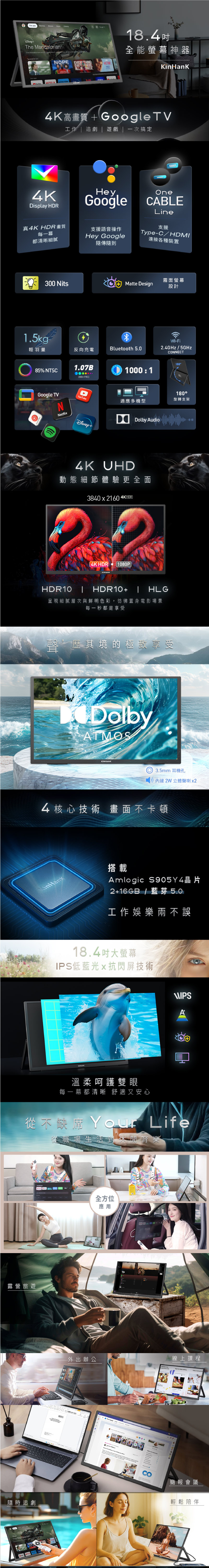 包裝規格 40*26.5*6.5 公分 1620克面板類型:IPS屏幕尺寸:18.4英寸分辨率全高清:3840x2160 (4K HDR)顯示顏色:10.7B亮度:300cd/m2對比度:1000:1縱橫比:16:10處理器:ARM 四核心64位元 Cortex-A35記憶體:DDR4 2GB存空間:eMMC 16GB顯示晶片:ARM Mali-G31 MP2 GPU / 支援 OpenGLES3.2 Vulkan1.1.1 OpenCL2.0HDR:支援 HDR10、HLG、HDR10+作業系統OS:GTV 12數位版權管理DR:Widevine解析度:最高支援4K@60fpsWi-Fi:雙天線 MIMO支援:2.4GHz/5GHz,802.11 a/b/b/g/n/ac藍芽:5.0螢幕更新率:60Hz電源供應:外接65W PD功耗:最高 35W顯示尺寸(長x寬x厚度):434mm x 252mm、5.8mm(最薄)數位影像輸出:HDMI 2.1 支援HDCP電源輸入:Type-C接口其他介面:電源指示燈、重置孔*Type C 接口的手機或筆電,若需透過Type C 投影螢幕,手機或筆電本身需有支援”影像輸出(DisplayPort)”,若需此功能的用戶請先確認手機或筆電是否支援*電腦或手機需能支援 USB-Type C(USB 3.1 映像入力・給電用),請務必確認