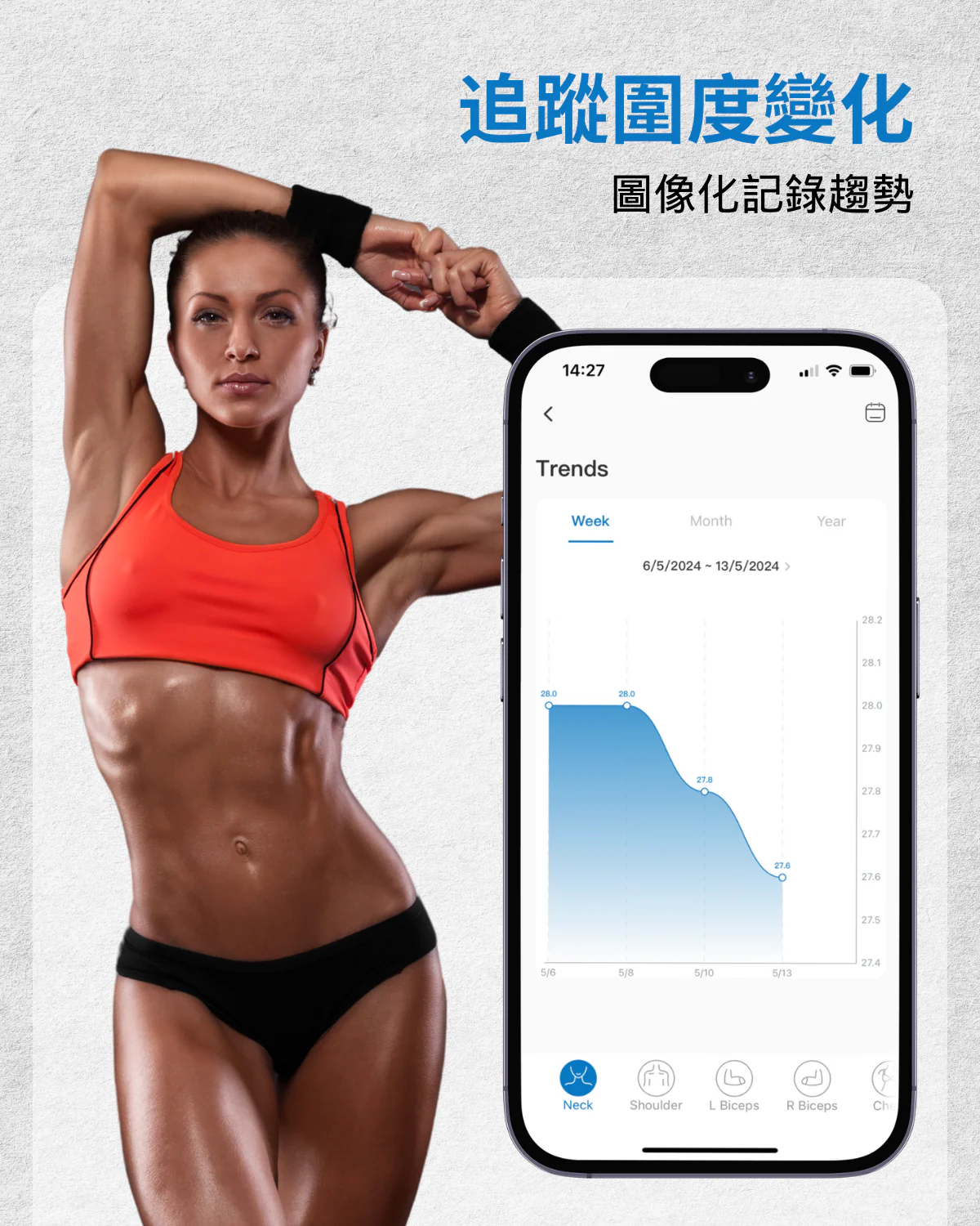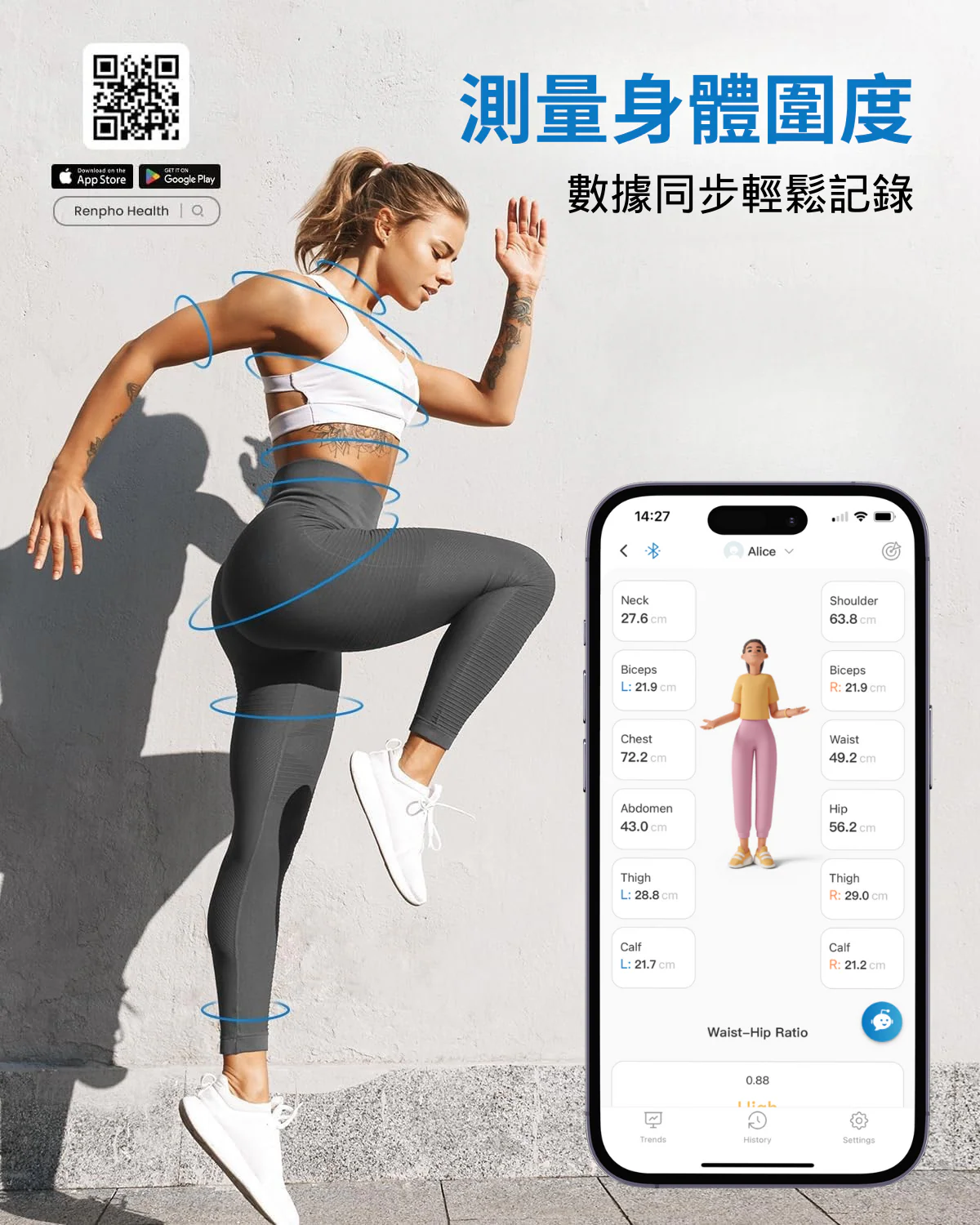 大液晶顯示幕,讓您方便的讀取數APP可以保存測量數據追踪您的身體部位尺寸變化趨勢.隨時間進程了解身體部位尺寸變化如果您希望隨著時間的進程知道您的身體部位的尺寸變化,這是最適合您的智能身體測量捲尺。.連接 Renpho Health APP透過APP應用程式即時保存的測量數據,讓您免去麻煩!選取身體特定部位進行測量亦可自訂部位,以曲線圖記錄數據,您可根據過往紀錄訂定目標計畫,讓Renpho 智能捲尺成為最佳小幫手!免費下載:App storeGoogle Play.貼心的易鎖鉤(Easy-Lock)設計有了這款創新的智能捲尺,測量時不再需要其他人的幫助,讓您可以自行快速測量身體部位周長;既安全又不勒肉造成部位不適。.廣泛適用不同人群非常適合訓練雕塑身形者或短時間需要密集量測監控身體人士,無論您是健身愛好者、增肌、瘦身,亦或是準媽媽;追踪您的身體部位尺寸變化趨勢從未如此簡單。.易於閱讀讀取傳統測量工具上的小數字和線條很困難,並且可能導致看錯而記錄錯誤,Renpho 智能捲尺有大液晶顯示幕,讓您以清晰、直觀方式讀取數據。.2種測量模式Renpho 智能捲尺不僅能測量身體、物品周長;亦可測量直線,不管是要測量肩寬,又或是衣著的寬度,這款捲尺都能協助完成任務!產品規格產品型號:RF-BMF01測量模式:長度 / 周長單位:cm(公分) / in(英寸)精度:1 cm(公分) / 1/16 in(英寸)電池規格:CR2032(未內附)尺寸:58 × 71 mm(公厘)淨重量:0.1g(公克)NCC:CCAB22LP1050T9製造地:中國