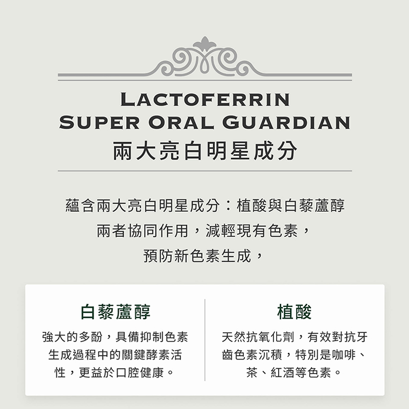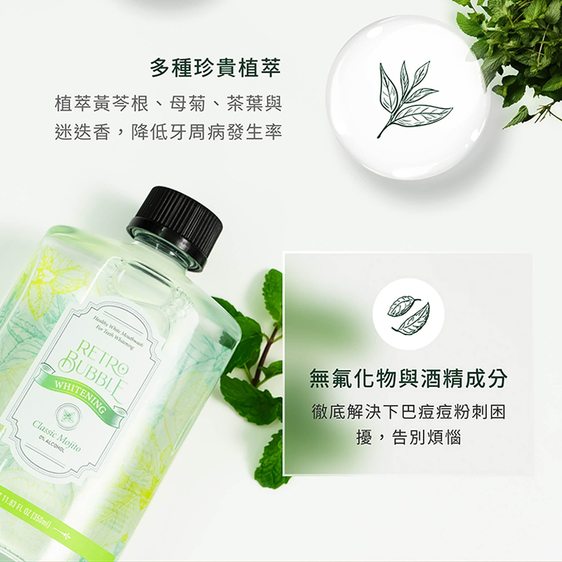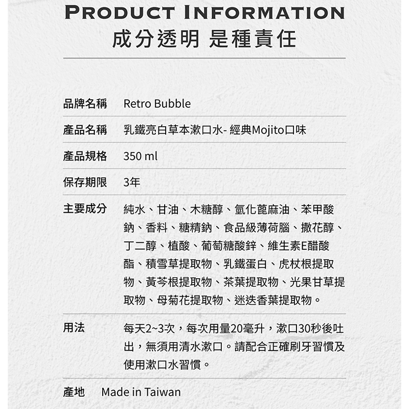 「乳鐵亮白草本漱口水-MOJITO口味」為您帶來口腔健康與美白體驗。融合清新薄荷和Mojito風味,專注亮白和口腔防護,含乳鐵蛋白、木醣醇,植酸和虎杖根,清潔明亮牙齒。積雪草和光果甘草提供潤澤修護,植物精華預防牙周病。無氟化物和酒精,解決下巴痘痘粉刺問題。感受溫柔舒適口腔護理,展現自信笑容!