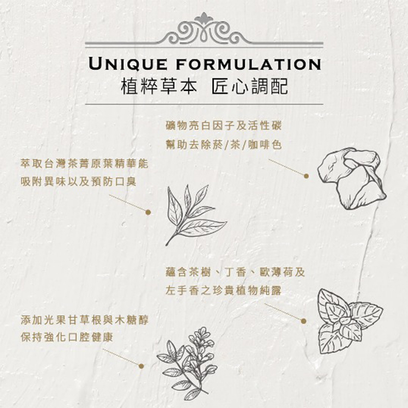 ●礦物亮白因子及活性碳幫助去除菸/茶/咖啡的色漬●萃取台灣茶菁原葉精華,能吸附異味,預防口臭●蘊含丁香、歐薄荷及左手香之珍貴植物純露●添加光果甘草根與木醣醇保持強化口腔健康●無添加氟、石化系界面活性劑及防腐劑