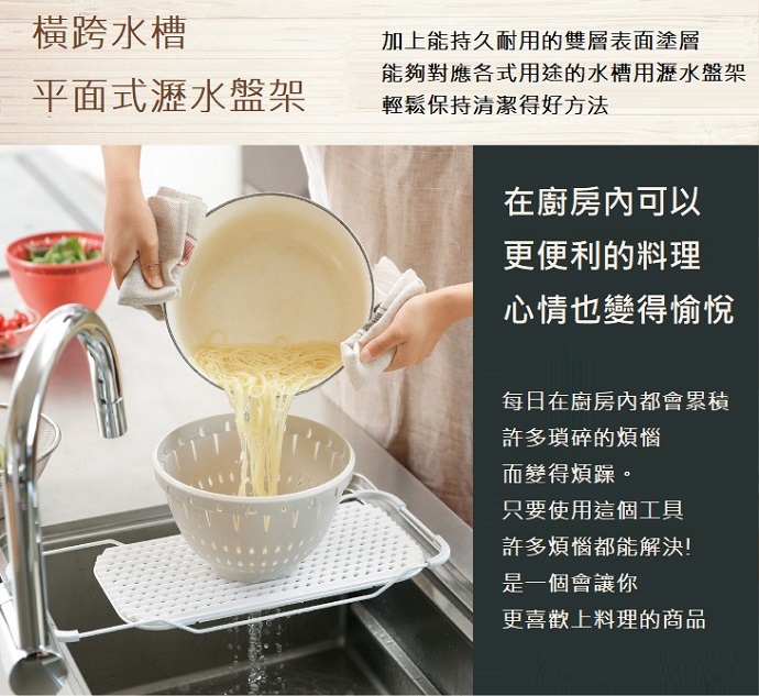能輕鬆對應不同用途需求做出變化,料理更輕鬆可當餐具瀝水架使用,節省空間又方便亦可當成料理輔助平台使用,確保料理空間設置在水龍頭出水口下可方便清洗物品,無須直接放在水槽設有卡榫,外層框架能拆下清洗本體尺寸:約18.6×3.3×47cm材質:本體/鋼(粉體烤漆+清漆)・瀝水盤/PP 防滑物/熱可塑性彈性合成橡膠原産国:越南*平面上方最多承受約3KG*適用於長約36-42CM水槽