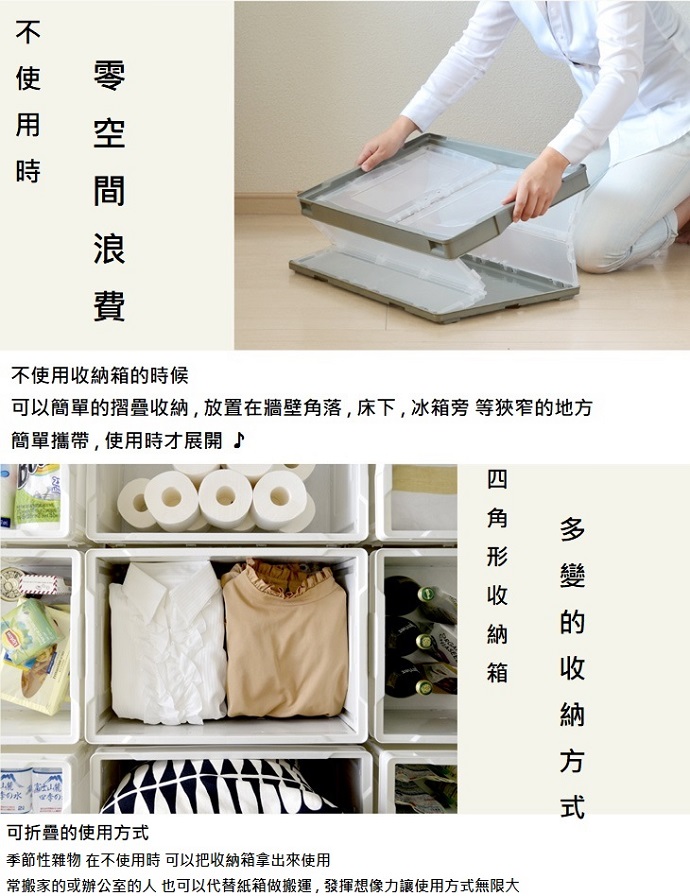 這是一個可以折疊的收納箱,半透明的外觀,您可以很清楚的知道內容物食材收納、雜物收納、車用收納...等,都不是問題當您不需要它時,只要折疊起來折疊後的高度僅有7cm,所以非常不占空間最高還可堆疊至五層,每層的底部載重達10公斤尺寸:長530×寬366×高272(mm)折疊後 尺寸:長530×寬366×高68(mm)材質 : PP 容量 : 40L載重 : 10KG原產地:日本製*全白色為非半透明材質*此商品蓋子需另外加購