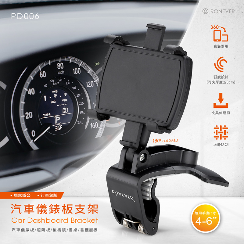 • 夾具伸縮扣,輕壓即可快速固定手機。 • 適用4-6吋手機,輕鬆安裝。 • 弧形設計,省力安裝,可夾厚度3cm。 • 矽膠止滑設計,材質柔軟不傷儀表板表面。 • 加厚條紋止滑墊,加強抓力更穩固。 • 360°調整視角方向,橫豎皆可。 • 180°輕鬆折疊收納,不擋行車視線。 • 可用於汽車儀表板,居家辦公等。 適用種類:4-6吋手機 展開尺寸:約85x90x165mm 折疊尺寸:約85x90x100mm 材 質:ABS塑膠、鐵、矽膠 重 量:約90g 包裝內容:汽車儀錶板支架X1