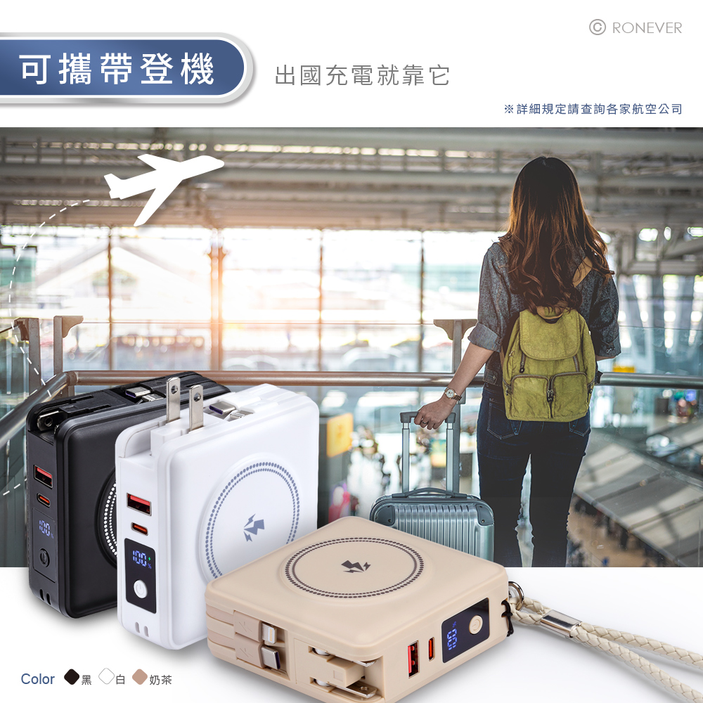 • 兼容多種 Type-C / Lightning 接口設備。• 快充介面設計,最大輸出10W,強力磁吸無線充電,精準對位吸附,最大輸出15W。• 摺疊式AC插頭,可直接插入電源插座,當作充電器使用。• 隱藏式手機支架,可方便邊充邊使用。• 自帶堅韌雙線設計,無需額外攜帶充電線,方便外出旅遊好收納,可帶上機出國。• 電量顯示,輕鬆掌握電源狀態,15000mAh大容量,提供設備滿滿電力。• 附贈專屬配色編織掛繩與金屬扣環,兼具美觀與實用。• 充電盤凸起設計,不卡手機鏡頭,支援兼容MagSafe手機殼、AirPods。額定容量:USB-A:4.5V/10000mAh,USB-A/Type-C/Lightning線/Type-C線:5V/9750mAh, 9V/5250mAh, 12V/3750mAh行動電源模式 : Type-C輸入:5V/2.5A,9V/2.0A,12V/1.5AType-C輸出:5V/3A,9V/2.22A,12V/1.67AUSB-A輸出:5V/4.5A,4.5V/5A,5V/3A,9V/2A,12V/1.5ALightning線輸出:5V/2AType-C線輸出:5V/2A,9V/2A,12V/1.5A無線輸出:5V/5W,7.5V/7.5W,9V/10W,9V/15W(USB-A)+(Type-C)+(Type-C線)+(Lightning線)+無線輸出合計最大輸出:5V/2A+5W,最大總輸出:22.5W充電器模式 : 額定輸入:100-240Vac,50/60Hz,0.4AUSB-A輸出:5V/2.4ALightning線輸出:5V/1.5A Type-C輸出:5V/2.4AType-C線輸出:5V/2A無線輸出:5V/5W 多口輸出模式:(USB-A)+(Type-C)+(Type-C線)+(Lightning線)合計最大輸出5V/2.8A尺寸:約83x83x33mm重量:約326g產品材質:塑膠 / 電子零件電池類型:聚合物鋰電池包裝內容:行動電源x1、掛繩x1、說明書x1