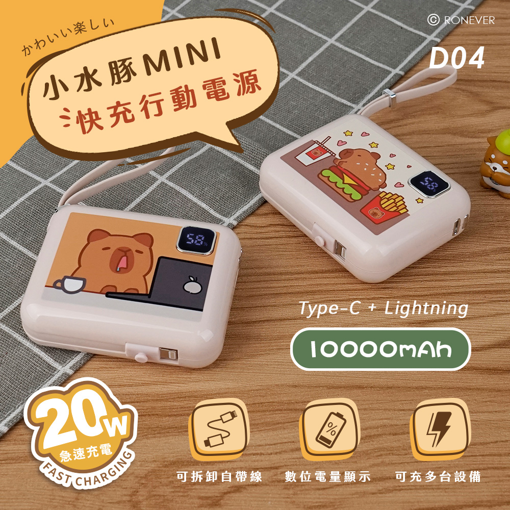 • 快充介面設計,最大輸出20W。• 自帶二合一充電線,支持多台設備同時充電。• 可拆卸自帶線,可幫設備充電,也可拆下幫行動電源充電。• 線槽收納,小圓點設計,取線方便。• 數字顯示電量,方便隨時預覽。• 通過國家BSMI安規合格認證,品質有保障。產品名稱:MINI快充行動電源10000mAh 產品型號:D04電池容量:3.7V/37Wh 電池類型:聚合物鋰電池額定容量:Type-C / 自帶線Type-C / 自帶線Lightning / USB-A:5V/5300mAhType-C / 自帶線Type-C / USB-A:9V/2600mAhType-C / 自帶線Type-C / USB-A:12V/2000mAh輸入接口:USB-C / lightning輸出接口:USB-C / USB-A / 自帶線lightning / 自帶線USB-C輸入電壓電流:lightning輸入:5V/2A,9V/2A,12V/1.5AUSB-C輸入:5V/2A,9V/2A,12V/1.5A輸出電壓/電流:USB-C/USB-A輸出:5V/3.1A,9V/2.22A,12V/1.67A自帶線lightning輸出:5V/3.1A自帶線USB-C輸出:5V/3.1A,9V/2.22A,12V/1.67A最大輸出:20W最大合計輸出:15W執行標準:CNS15364(102年版),CNS13438(95年版),CNS14336-1(99年版)尺寸:83x65x26mm重量:190 ± 10g