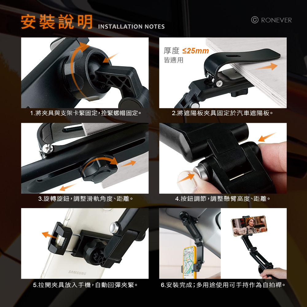 • 球型360°軸承旋轉調整角度,直豎通用。• 按鍵多段高度調節,摺疊不占空間。• 滑軌調整可旋轉調整角度、前後距離。• 支架帶矽膠止滑墊可抗震、防滑,不傷遮陽板、手機,行車更安全。適用手機尺寸:4" -7.2"安裝位置:汽車遮陽板產品尺寸:約40x80x150mm(支架收合)材質:PC、ABS塑膠、五金、矽膠重量:約176g 內容物:手機支架x1