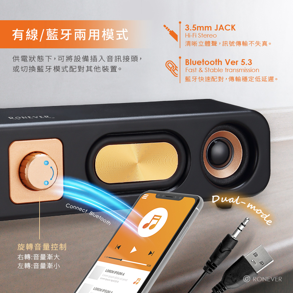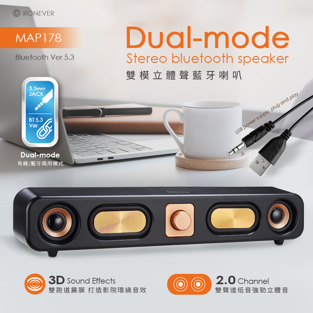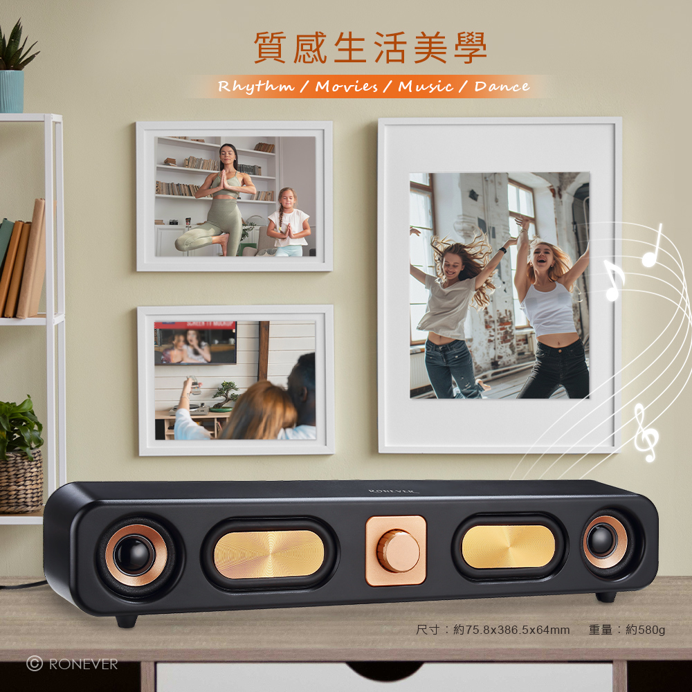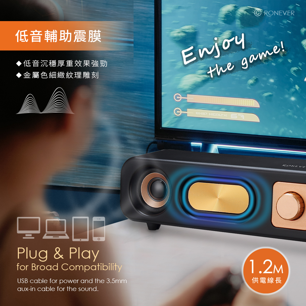 • 低調沉穩色澤,質感磨砂外型,添增生活美學。• 金屬色紋理雕刻,低音震膜沉穩厚重效果強勁。• 採用2吋3W喇叭,雙聲道音頻系統,清晰立體音質。• 兩用設計,可連接藍牙或插入音訊,適用多種設備。• 高感度立體聲3.5mm迷你端子,訊號傳輸不失真。• 藍牙5.3晶片,傳輸穩定低延遲,最佳的聽覺享受。藍牙技術︰藍牙5.3額定電壓︰DC 5V/1A喇叭規格︰2英吋x2 + 跑道震膜x2輸出功率︰3Wx2頻率接收範圍︰10M頻率響應︰100Hz-20KHz連接介面︰3.5mm供電介面︰USB信噪比︰≧75dB阻抗︰4Ω材質︰PP塑膠、電子零件電源線長︰約1.2m產品尺寸︰75.8x386.5x64mm重量︰約580g包裝內容:藍牙喇叭x1、說明書x1