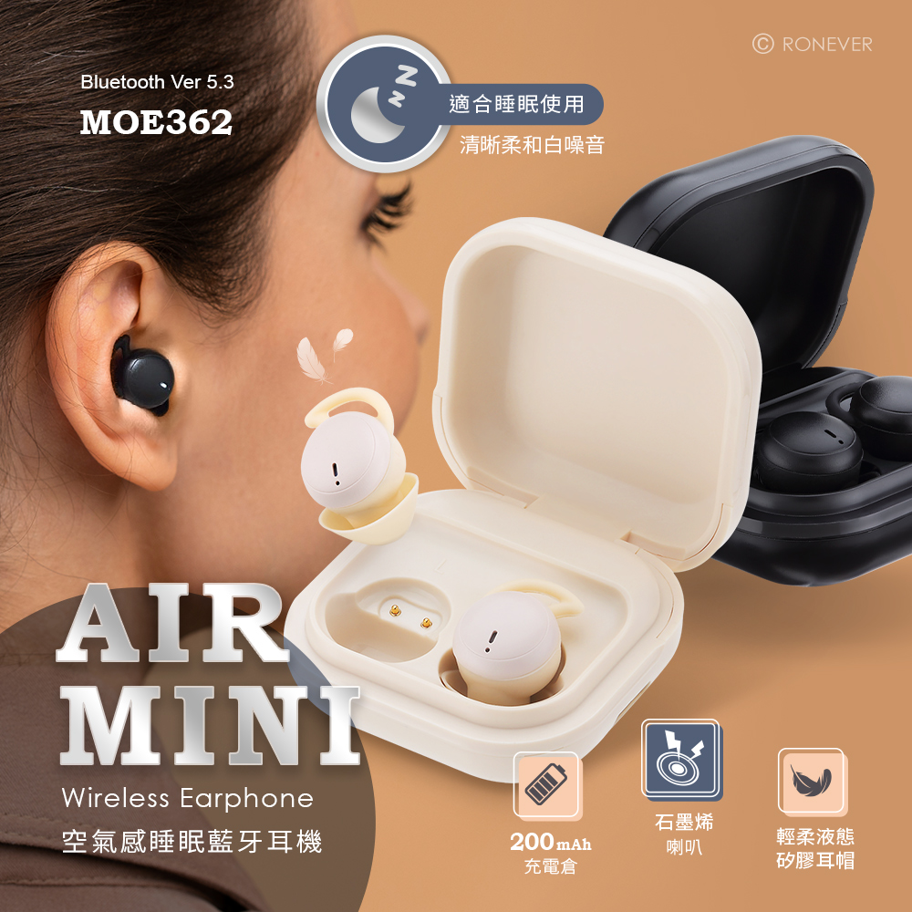 • 最新5.3藍牙晶片,低延遲360°環場聽音辨位更精準。• 結合ENC降噪/物理隔噪,更沉浸的聆聽環境。• 石墨烯振膜讓音質更清晰細節更豐富,音場與沉浸感更勝一籌。• 用來聽助眠的白噪音,尤其雨滴或流水聲音相對乾淨又輕柔。• 極致超輕量化設計,空氣感配戴,睡眠側躺無壓迫感。• 液態輕柔矽膠耳帽,耳勾貼合耳窩更隱形零感。• 耳機及充電倉皆有指示燈設計,狀態清楚明瞭。藍牙版本︰藍牙5.3通話處理技術︰CVC6.0 / ENC電池容量︰25mAh充電時間︰約2小時通話時間︰5小時~15小時(音量大小有所差異)接收範圍︰10M(空曠環境)麥克風靈敏度︰-35dB±2喇叭靈敏度︰109dB±2頻響範圍︰2402Mhz-2480Mhz耳機重量︰2g±1(單耳)耳機尺寸︰14x18x16mm額定電壓︰DC 5V / 0.5A充電介面︰TYPE-C充電盒容量︰200mAh充電盒充電時間︰約2-3小時充電盒尺寸︰48x45x25mm充電盒重量︰23g±1材質︰ABS+電子零件包裝內容︰藍牙耳機x1組、充電線x1、說明書x1