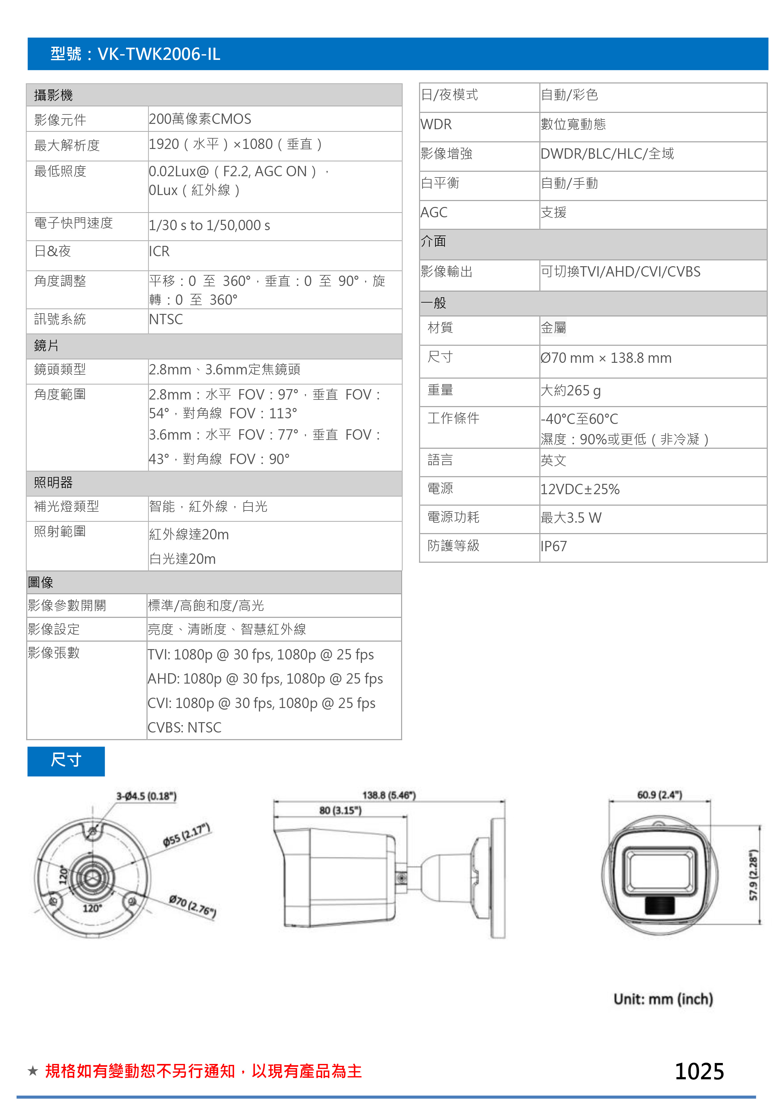 昌運監視器 SAMPO 聲寶 VK-TWK2006-IL 1080P紅外線槍型攝影機 IP66防護等級