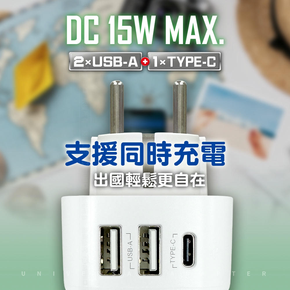 SAMPO EP-MWSG2A1C3 USB Travel Adapter with Dual Round Pins, Compatible with Germany, EU, Russia, South Korea, and Indonesia.