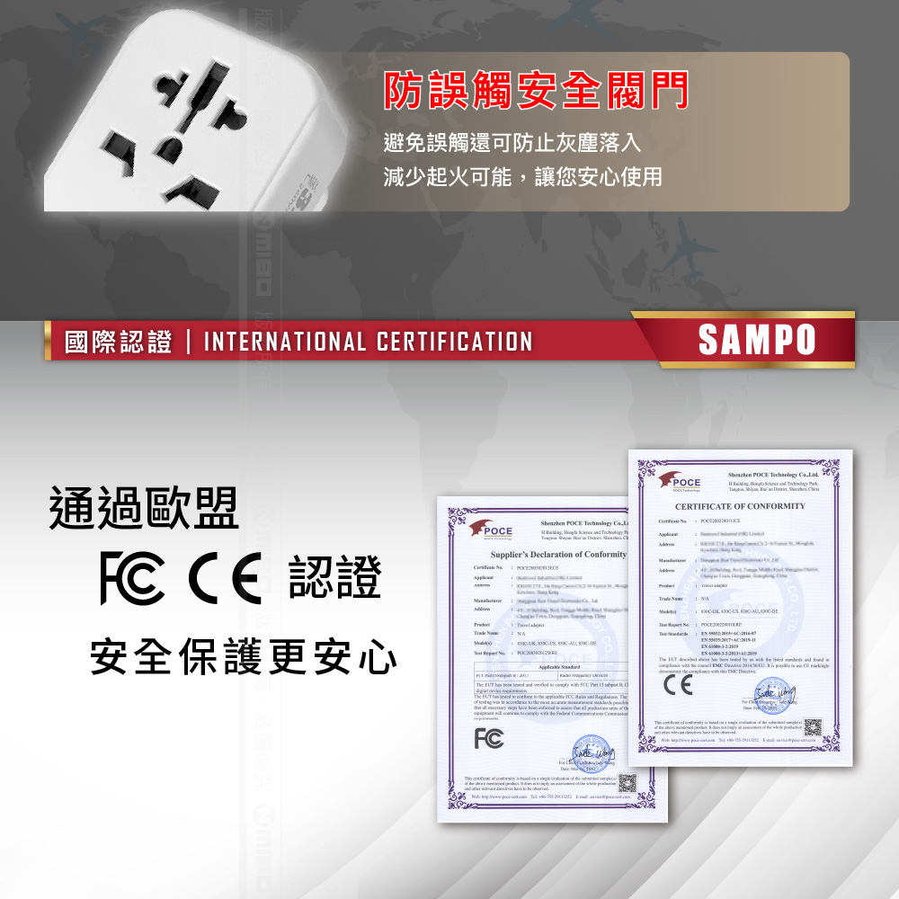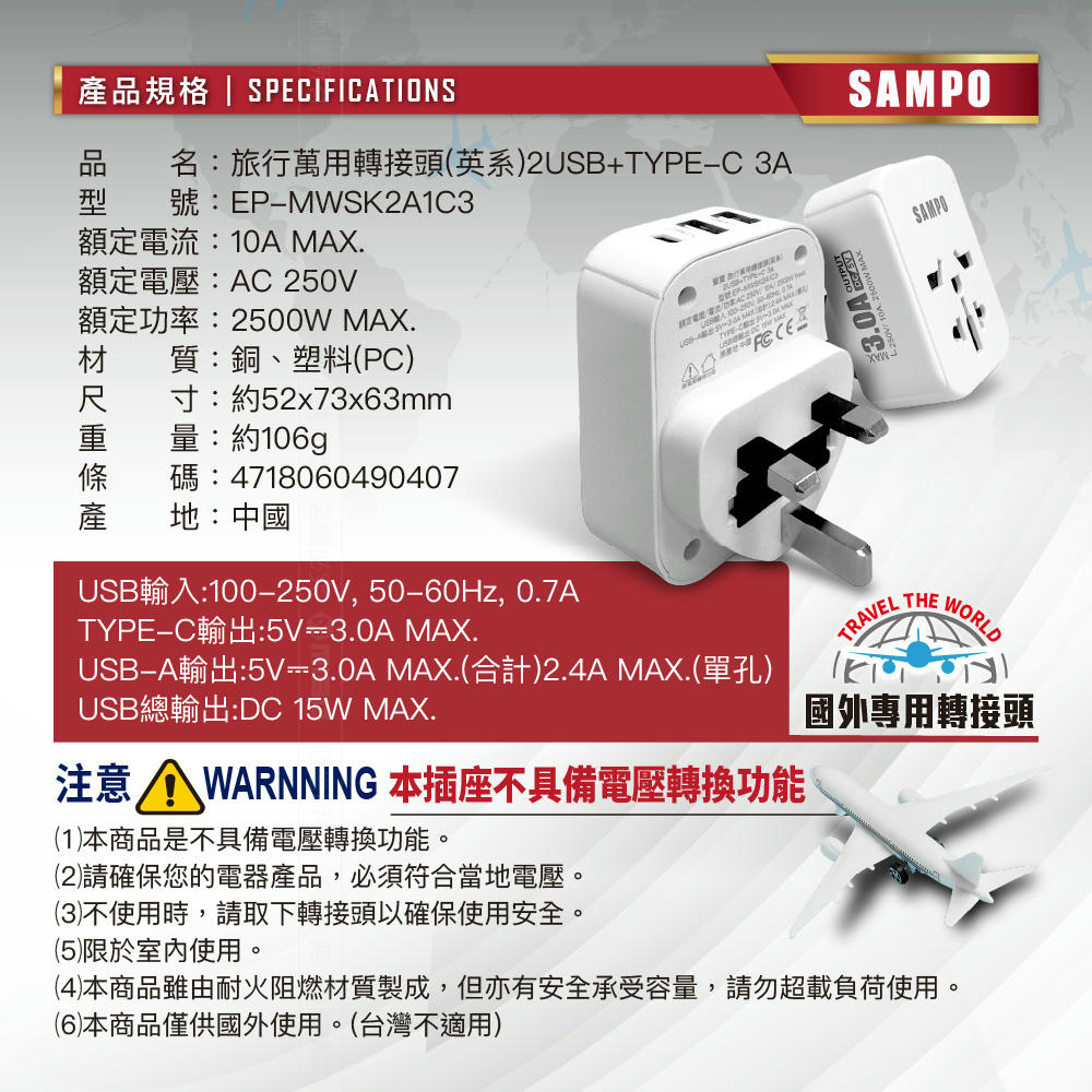 SAMPO 聲寶 EP-MWSK2A1C3 旅行萬國轉接座 扁型三腳