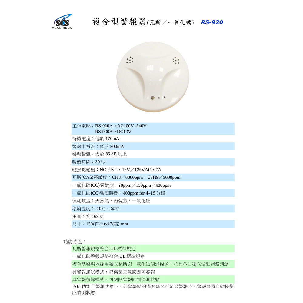昌運監視器 SCS RS-920(RS-920B) DC12V 複合型警報器(瓦斯/一氧化碳)
