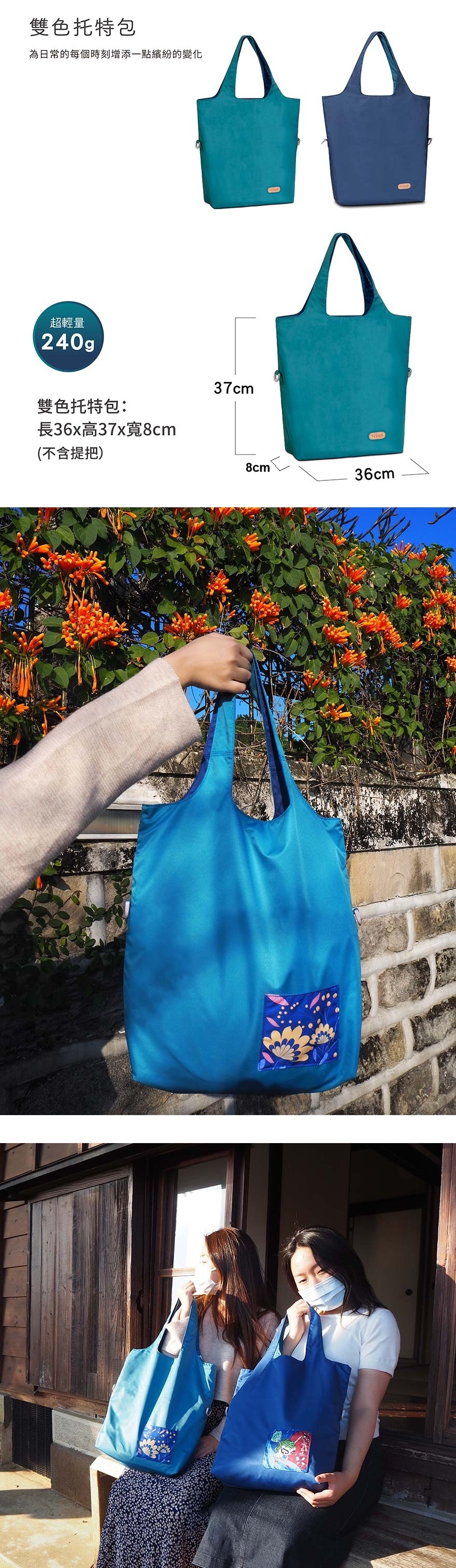 MIT 台灣製| 100% MIT 台灣原創設計,在地生產。 再生環保布| 回收寶特瓶再製材質,為永續環保盡一份力。 雙面用設計| 可翻面換色使用,內外都是正面,搭配衣物豐富多元。 防潑水抗污| 裡外皆防潑水布料,不擔心雨天或髒汙。