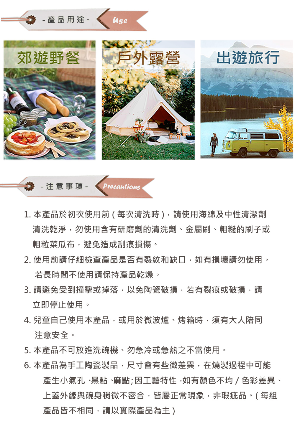 6.本產品為手工陶瓷製品,尺寸會有些微差異,在燒製過程中可能產生小氣孔、黑點、麻點;因工藝特性,如有顏色不均/色彩差異、上蓋與碗身設計非完全密合,皆屬正常現象,非瑕疵品。(每組產品皆不相同,請以實際產品為主)