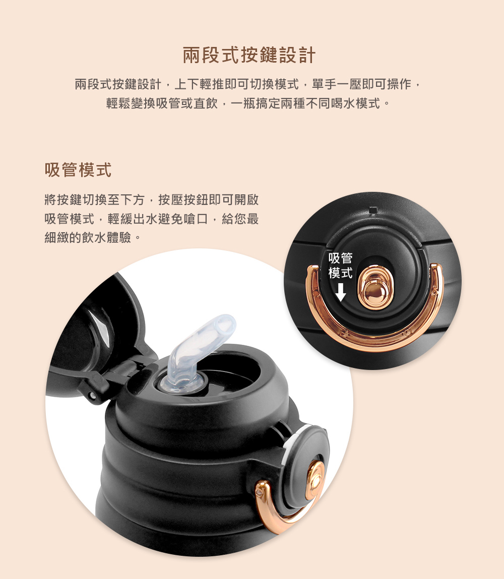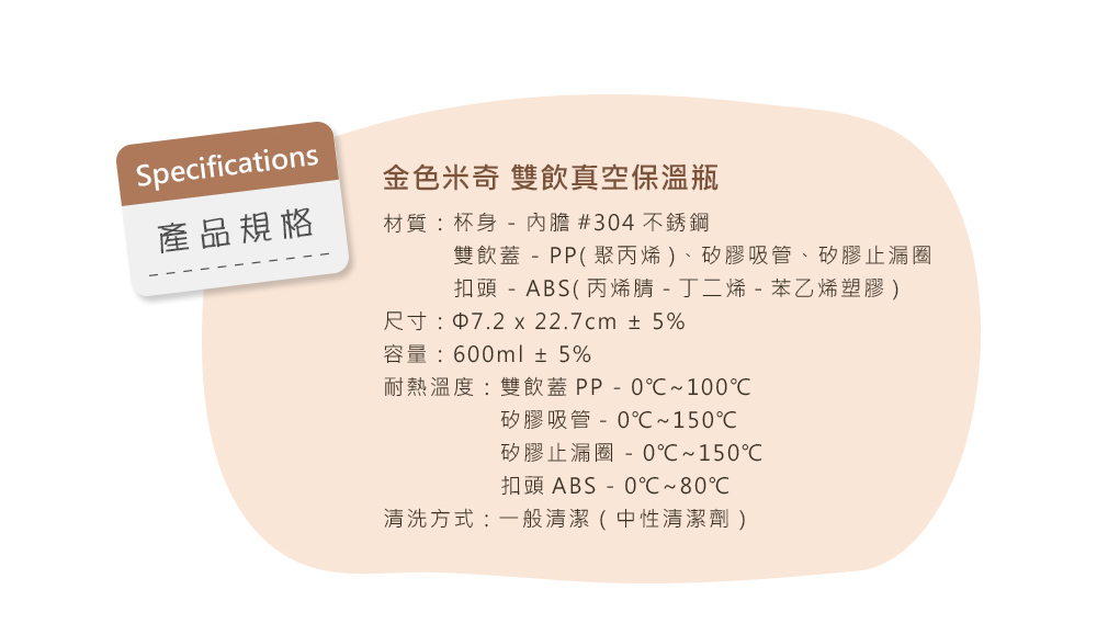 耐熱溫度:雙飲蓋PP - 0℃~100℃、矽膠吸管- 0℃~150℃、矽膠止漏圈 - 0℃~150℃ / 扣頭ABS - 0℃~80℃
