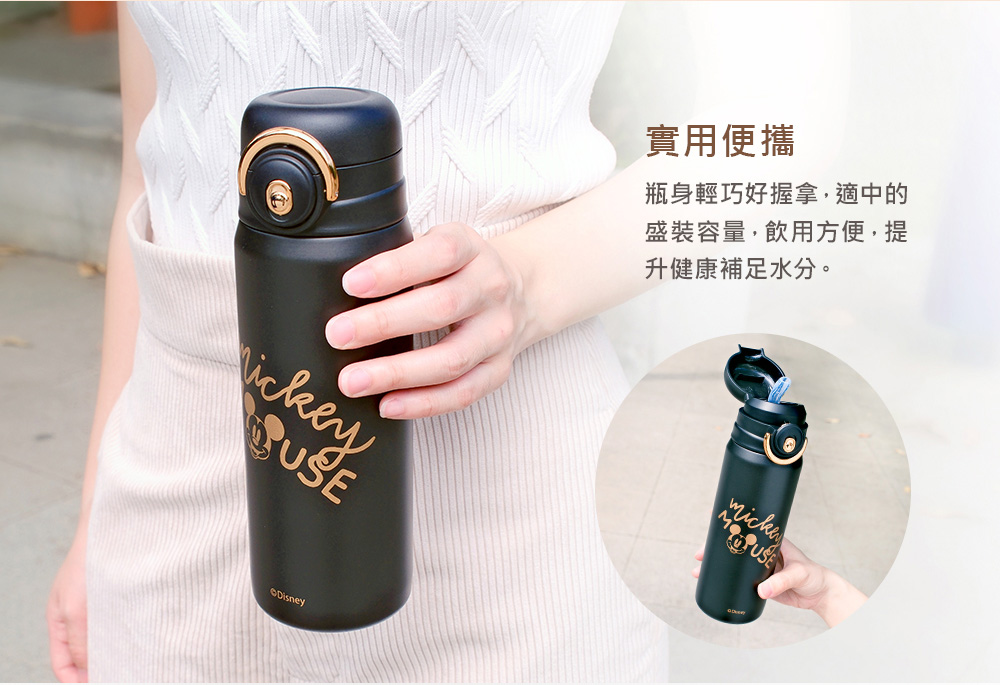 Disney Gold Mickey Mouse Stainless Steel Silicone Dual-Drink Vacuum Insulated Bottle 600ml (Lockable) - Obsidian Black