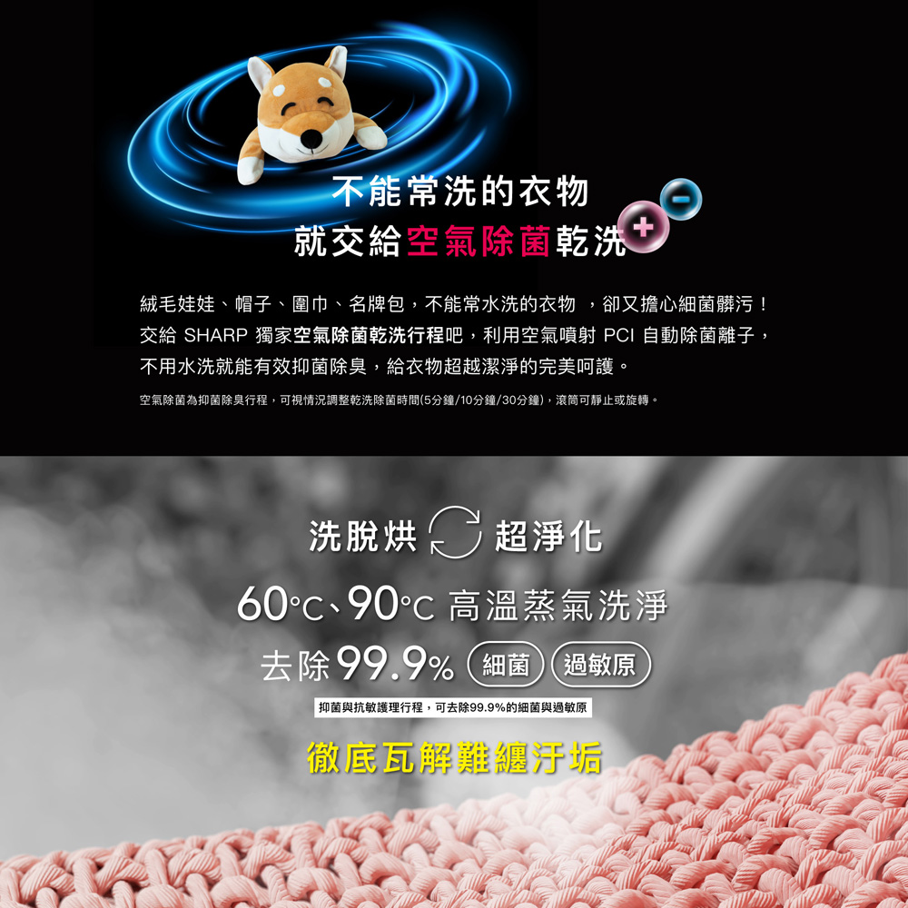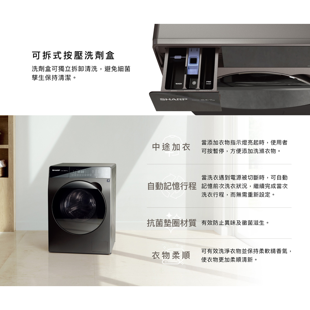 商品特色:AIoT智慧機種:洗衣行程推播通知+洗衣便利通榮獲 iF設計大獎鏡面觸控大面板18˚觸控傾角設計獨家Dry AirWash空氣除菌離子技術,空氣"乾"洗無死角,徹底除臭除菌獨家水冷凝式高效率乾衣技術颱風等級18m/s超強風速,勁風烘乾獨特風鼓設計+晶鑽立體內槽全新超淨洗瀑布流技術高溫蒸氣洗淨 除菌99.9%90˚C 高溫槽洗淨 徹底除臭殺菌日本J-TECH變頻技術 省電效率47%金級省水標章/節能標章4組專業避震器設計6段水溫洗淨(冷水/20/30/40/60/90°C)15分鐘淨速洗程*抗菌墊片材質設計,有效抑制異味商品規格:型號:ES-FKA105WDT顏色:尊爵灰容量:10.5kg烘衣容量:7kg額定電壓頻率:AC 110V / 60Hz可變轉速:有面板顯示:液晶面板顯示預洗功能:〇預約時間:〇排水棉絮濾網:〇筒槽夜視燈:〇變頻:J-TECH變頻技術操作面板:觸控式操作內槽材質:晶鑽不銹鋼兒童安全鎖:〇槽洗淨功能:〇(90˚C 高溫槽洗淨)節能標章:金級本體尺寸(不含軟管):59.8 x 68 x 85 cm外箱尺寸:65 x 74 x 89.5 cm重量:毛重 78kg / 淨重 73kg產地:中國貨源:公司貨保固:一年NCC:CCAI17LP075CT9BSMI:R3B801本商品資訊由網路及官網收集彙整而成,僅供參考,如有更新或異動不另外通知,正確商品資訊及規格以實機為準。鑑賞期非試用期,產品一經拆箱、插電及使用皆會影響您退貨權利。廢四機回收資訊:如需回收廢四機請於下單時備註,如未於訂單備註,後續需另派工收回將酌收派工費用500~1200元(跨區費另計)新購公告指定規格之電視機、洗衣機、電冰箱或冷、暖氣機時,販賣業者應提供同項目、數量、時間及同送達地址之廢四機回收(搬、載運)無償服務。但不包含為搬運、拆卸而動用大型機具、工程或危險施工等。消費者本人簽名確認已被口頭告知或知悉上述權益。本站配合環保署廢四機回收服務,本公司廢四機回收專線:0800-550678,環保署資源回收專線0800-085717。