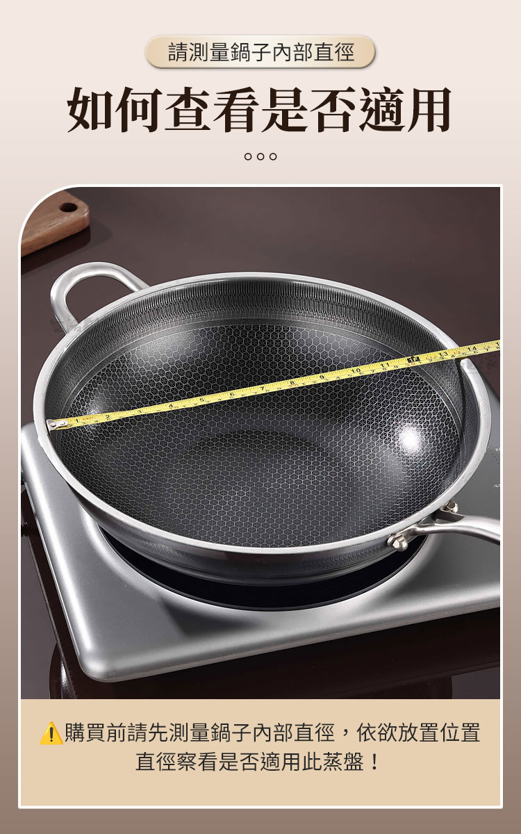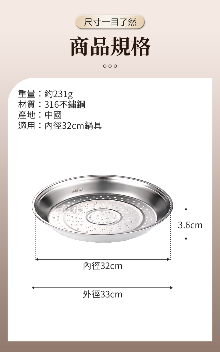 商品規格:1.外徑尺寸:約直徑33*高3.6cm2.內徑尺寸:32cm3.材質:316不鏽鋼4.重量:約231g/入5.產地:中國6.適用:內徑32cm鍋具7.商品:炒鍋專用蒸盤32cm*1※商品為人工丈量略有誤差,請以實品為準。※網頁圖片因拍攝關係或螢幕設定不同而會與實際商品略有色差,請以實際收到商品為準。