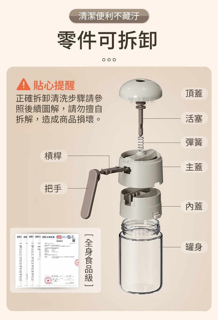 生活采家密封定量玻璃鹽罐|180ml健康控量調味瓶用傳統鹽罐時,總是難以掌握份量,常常一撒就過量。這款 生活采家 密封定量玻璃鹽罐180ml,專為注重飲食均衡與健康的家庭設計,讓您烹飪更安心,吃得更放心。🍳✨✅ 0.5g精準定量:每次按壓固定出鹽,避免調味過量。✅ 密封防潮不卡鹽:特殊結構阻隔蒸氣,防止結塊,撒鹽更順暢。✅ 透明玻璃瓶身:耐用可視化設計,容量180ml,存量一目了然。✅ 多調味料適用:不只食鹽,還能裝糖、胡椒、辣粉、香料。✅ 單手操作輕鬆撒:烹飪時一手按壓,另一手翻炒,料理更順手。✅ 易拆卸清洗:零件可拆,水洗即可,乾淨不藏污。👉 使用後你會發現~👩🍳 炒青菜時,不再因為鹽倒太多而破壞味道;🥩 煎牛排時,鹽能均勻落在表面,風味更均衡;🥗 做沙拉時,也能輕鬆控制用量,健康不多鹽;全家大小都能享受美味又健康的餐桌。別讓過量的鹽分成為健康隱憂!選擇 生活采家密封定量玻璃鹽罐,不僅讓料理更專業,更能養成全家的健康飲食習慣。🔥立即入手,讓「均勻控鹽」成為您的廚房日常!👉 健康飲食,從控鹽開始!#密封定量玻璃鹽罐 #控鹽健康生活 #廚房調味好物 #均勻撒鹽不卡📣 FAQ (常見問答)Q1:這款鹽罐一次能出多少鹽?A1:每次按壓約0.5g,方便精準控量。Q2:除了鹽,可以裝其他調味料嗎?A2:可以,適用砂糖、黑胡椒、辣椒粉等乾燥顆粒調味品。Q3:會不會卡鹽或受潮?A3:不會,本產品採密封防潮結構,有效阻隔蒸氣,避免結塊。Q4:容量是多少?適合家庭使用嗎?A4:容量180ml,適合日常家用,大小家庭都能輕鬆使用。Q5:清洗容易嗎?A5:可拆卸設計,零件簡單沖洗即可,方便保持清潔。注意事項:1.僅適用乾燥顆粒狀調味料,避免液體或潮濕粉末。2.使用後請保持瓶身乾燥,避免水氣進入影響撒鹽。3.建議定期拆卸清洗,確保衛生與順暢使用。4.裝填調味料時,請勿超過瓶身最大容量線。5.請勿放入液體或含油性調料,以免影響按壓功能。