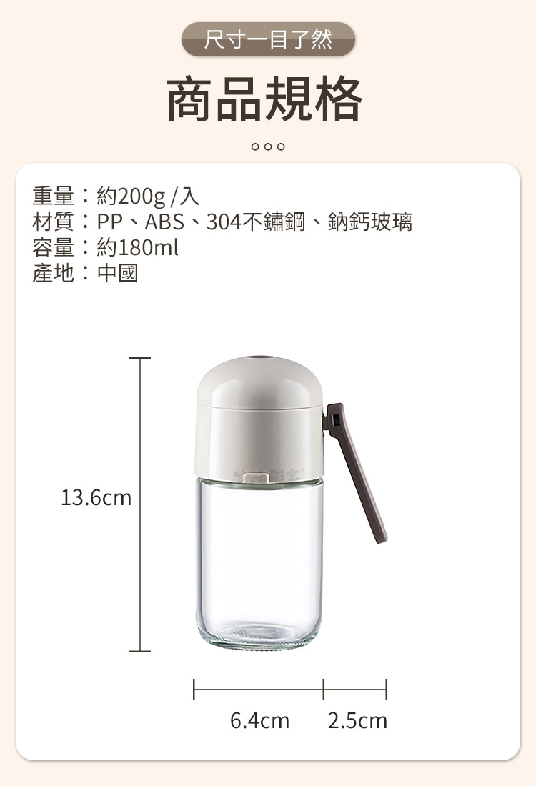 商品規格:1.尺寸:約W8.9*L6.4*13.6cm2.材質:PP、ABS、304不鏽鋼、鈉鈣玻璃3.容量:約180ml4.重量:約200g/入5.產地:中國6.商品:密封定量玻璃鹽罐調味瓶180ml*1※商品為人工丈量略有誤差,請以實品為準。※網頁圖片因拍攝關係或螢幕設定不同而會與實際商品略有色差,請以實際收到商品為準。
