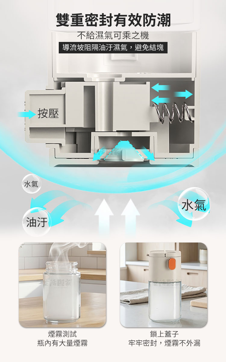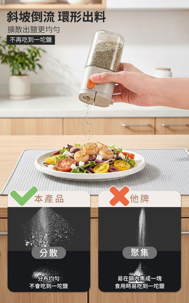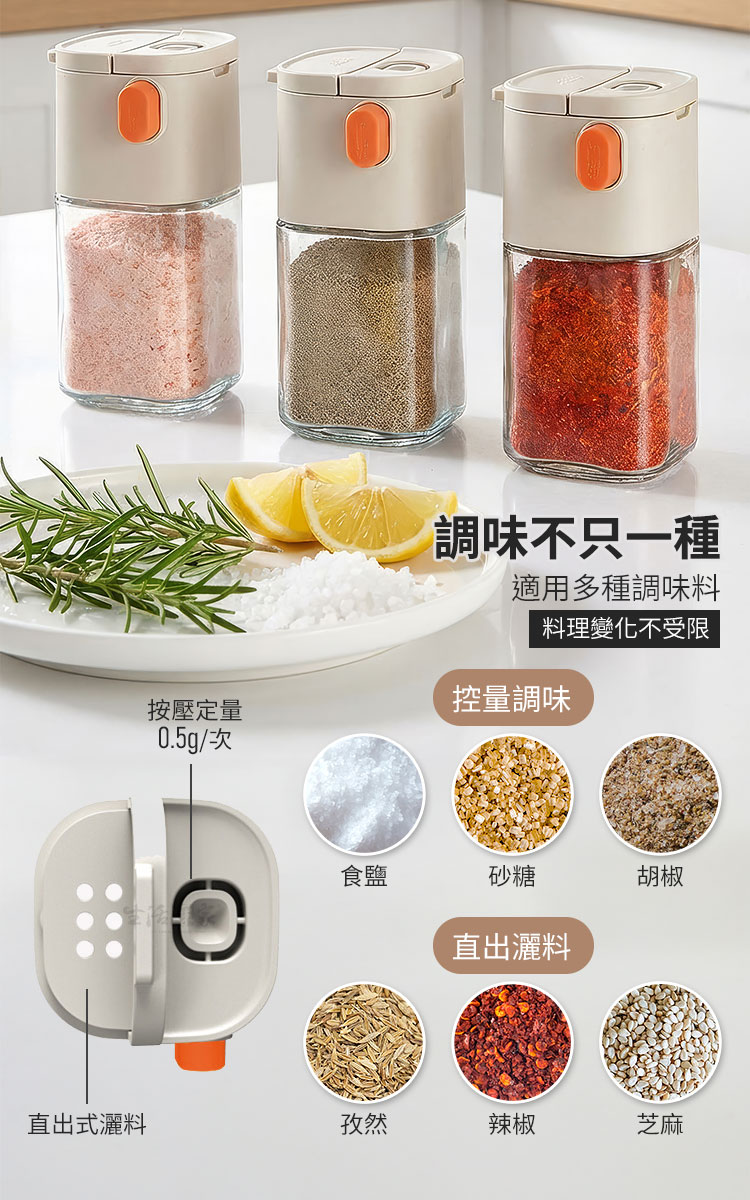 生活采家 二用型定量出鹽調味瓶 180ml|健康飲食的最佳料理幫手你是不是常常做菜時,一不小心就撒太多鹽?😅【生活采家 二用型定量出鹽調味瓶】專為健康飲食設計,單次按壓精準出0.5g,幫助你有效控鹽、減少負擔。✅ 定量出料 0.5g/次 — 精準控鹽,減少過量攝取,養成健康飲食習慣。✅ 單手操作設計 — 烹飪過程中輕鬆按壓,簡單省力,料理不慌亂。✅ 雙用設計 — 一瓶兩用,可切換「定量控鹽」與「大顆粒直出」模式,靈活應對各種食材需求。✅ 密封防潮結構 — 採雙重密封,有效阻隔水氣與油煙,避免調味料結塊。✅ 加厚玻璃瓶身 — 耐磨耐用,容量180ml,透明可視剩餘量,方便即時補充。✅ 可拆洗結構 — 全身可拆卸,零件好清潔,無死角不藏汙納垢。👉 使用後你會發現~🌿 鹽不再忽多忽少,調味均勻健康。🍲 烹飪效率提升,單手即可操作。🥗 不只是鹽,糖、胡椒、孜然、辣椒粉、芝麻…多種調味料都能輕鬆使用。💧 廚房環境潮濕也不怕,調味料保持乾燥不結塊。✨ 無論是日常家常菜,還是健康控鹽飲食,都能帶來滿滿便利感。還在用傳統撒鹽罐嗎?容易倒太多、結塊、不均勻,讓料理大打折扣。選擇【生活采家 二用型定量出鹽調味瓶】,讓每一道菜都精準調味,健康又美味!立即入手,成為您廚房的最佳助手!👉 快把它加入購物車,提升料理質感,讓健康控鹽成為生活習慣!#健康控鹽 #廚房必備 #定量調味瓶 #防潮設計 #生活采家📣 FAQ (常見問答)Q1:每次出料的份量是多少?A1:每次按壓約 0.5g,適合控鹽、控糖、控胡椒等精準調味需求。Q2:可以放哪些調味料?A2:適用於食鹽、白砂糖、黑胡椒粉、孜然粉、辣椒粉、芝麻等各類粉末或顆粒調味料。Q3:會不會因潮濕而結塊?A3:瓶身採雙重密封設計,有效防潮、防油煙,保持調味料乾燥。Q4:清潔方便嗎?A4:可全身拆卸,玻璃瓶身與上蓋零件皆可單獨清洗,乾淨無死角。Q5:容量是多少?能放多久?A5:容量約180ml,一般家庭日常使用可存放約1-2週調味份量,依實際使用情況而定。注意事項:1.請避免裝入含水分或過於黏性的調味料,以免堵塞。2.不同調味料重量略有差異,0.5g為參考值。3.使用後請保持瓶身乾燥,延長使用壽命。4.勿靠近火源或高溫環境,以免影響塑件與玻璃結構。5.清潔時建議以清水沖洗,避免使用強酸或強鹼清潔劑。商品規格:1.尺寸:約長6.5*寬6.5*高12.5cm2.材質:蓋子-PP塑料、瓶身-鈉鈣玻璃3.容量:180ml4.重量:約208g/入5.產地:中國6.商品:二用型定量出鹽調味瓶180ml_灰白*1※商品為人工丈量略有誤差,請以實品為準。※網頁圖片因拍攝關係或螢幕設定不同而會與實際商品略有色差,請以實際收到商品為準。