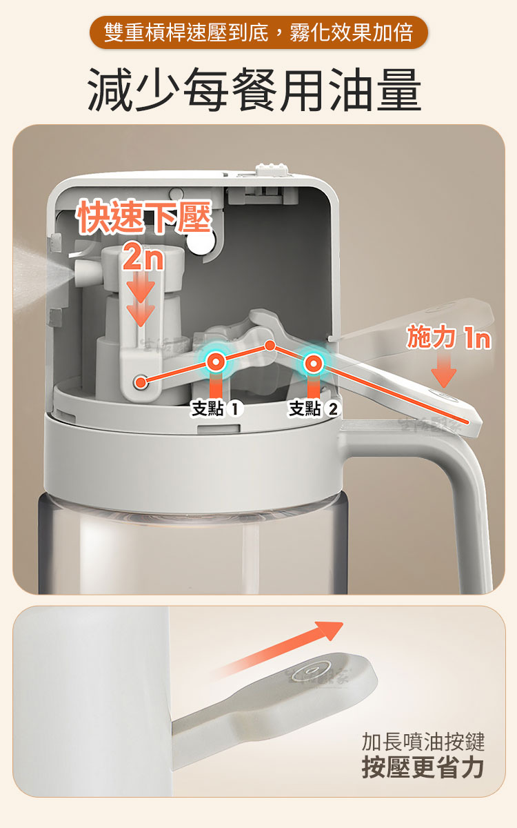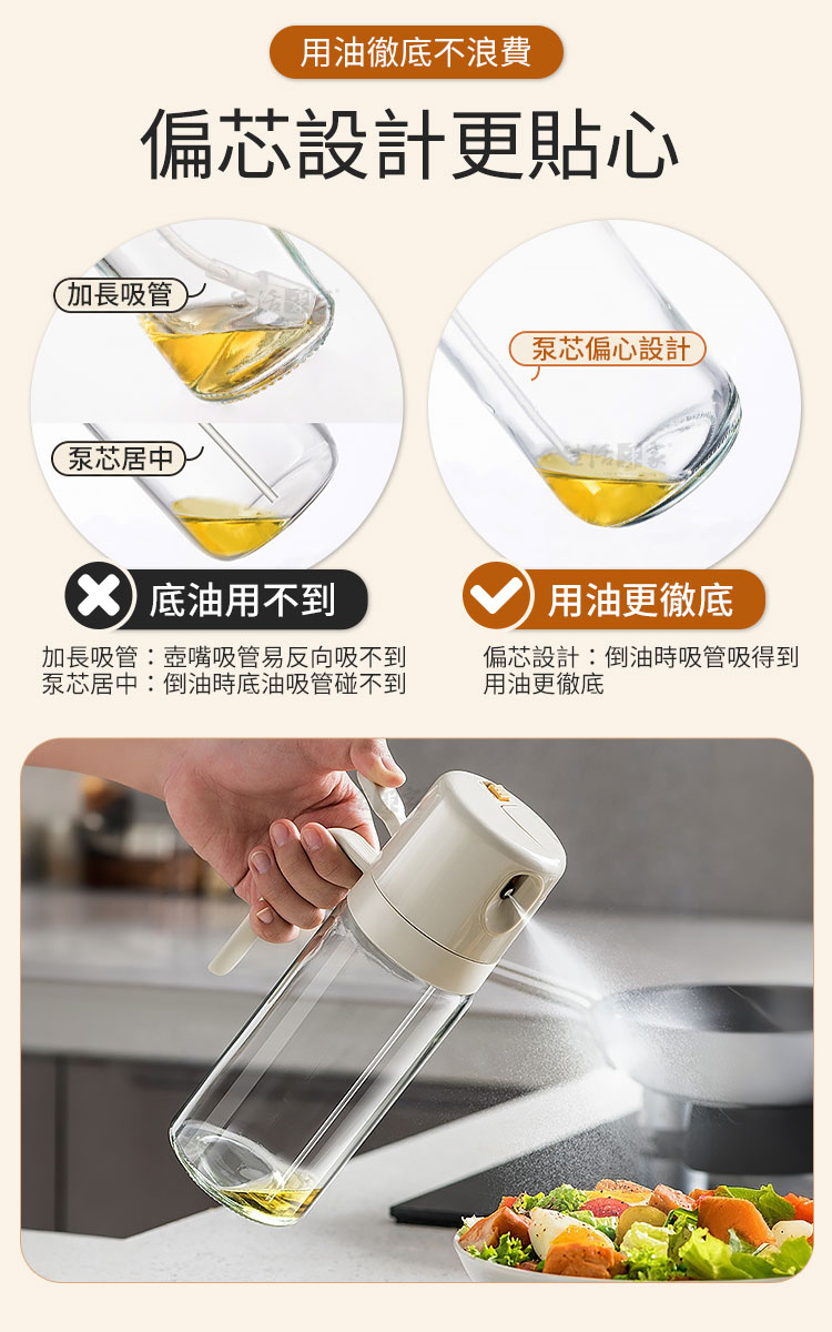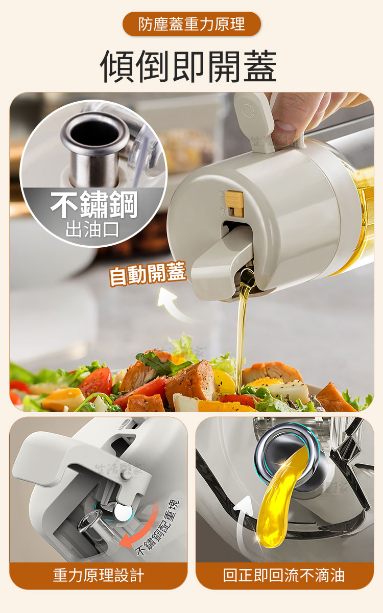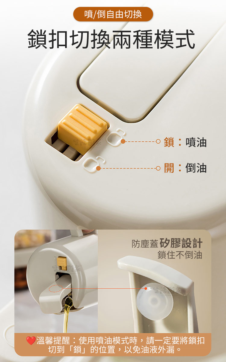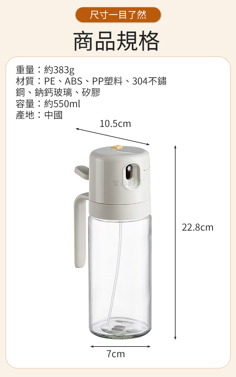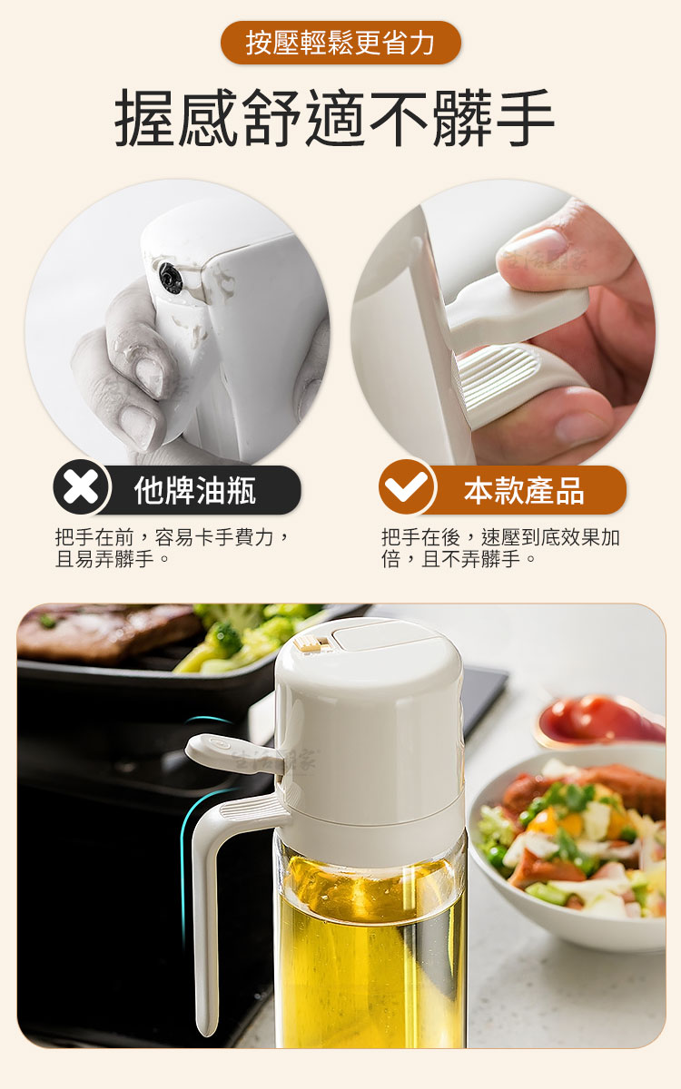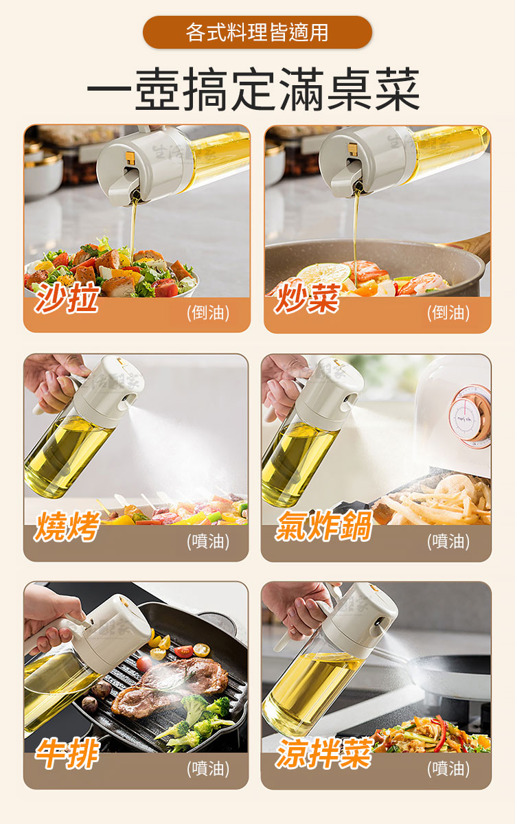 倒噴兩用玻璃油壺550ml|健康飲食從控油開始!🍳 想要料理美味卻又不想油膩負擔?【生活采家 倒噴兩用醬料玻璃油壺550ml】讓你輕鬆控油,一瓶搞定煎、炒、烘、烤、拌,從此開啟健康飲食新習慣!💡✅ 噴倒兩用設計:可一鍵切換噴霧或倒油,炒菜、沙拉、烘烤、氣炸鍋都能精準使用。✅ 550ml大容量:等同三瓶一般油噴壺容量,滿足日常家庭需求。✅ 均勻細霧噴灑:3D廣角霧化,減少油量使用,料理更健康。✅ 透明玻璃:無毛細孔安全衛生,透明瓶身方便查看剩餘油量。✅ 防漏防滴設計:傾倒即開蓋,回正即回流,不浪費每一滴油。👉 使用後你會發現~🥗 做沙拉:輕輕一噴,清爽均勻,避免過油膩口。🍳 煎炒烹飪:精準倒油,火候掌握更到位。🔥 氣炸鍋料理:均勻噴霧,少油也能酥脆可口。🍖 燒烤牛排:噴霧上油,香氣均勻,鎖住肉汁。➡️ 為什麼你需要它?現代人講究健康飲食,卻常難以控制油量。這款油壺,讓你「吃得美味,少油無負擔」。它不僅是料理的美型單品,更是全家健康的守護者。👉 一瓶搞定 煎、炒、烘、烤、拌,從此遠離過量油脂!✨ 別再猶豫!現在就入手,給自己和家人一份輕盈健康!#健康控油 #廚房神器 #噴倒兩用 #玻璃油壺 #少油飲食📣 FAQ (常見問答)Q1:這款油壺可以裝哪些油?A1:可裝橄欖油、葵花籽油、花生油、醬油、醋等液體調味品。Q2:用完油會滴油嗎?A2:不會,瓶蓋自動開合不滴油不掛油,不用擔心會弄髒桌面。Q3:噴霧會不均勻嗎?A3:本產品為3D廣角噴霧設計,霧化均勻,不會有大滴水珠。Q4:容易清洗嗎?A4:瓶口加大設計,可直接伸手或用刷子清潔,簡單方便。Q5:容量會太大嗎?A5:550ml適合家庭日常使用,不必頻繁加油,一瓶即可滿足多場景料理需求。注意事項:1.請勿盛裝高黏度液體(如蜂蜜、糖漿),避免堵塞噴頭。2.使用噴霧模式時,務必將鎖扣調整至正確位置,避免漏油。3.建議定期清洗瓶身與噴頭,保持出油暢通。4.遠離火源與高溫環境,以免瓶身損壞。5.初次使用請先用清水測試噴頭功能,確保噴霧均勻。