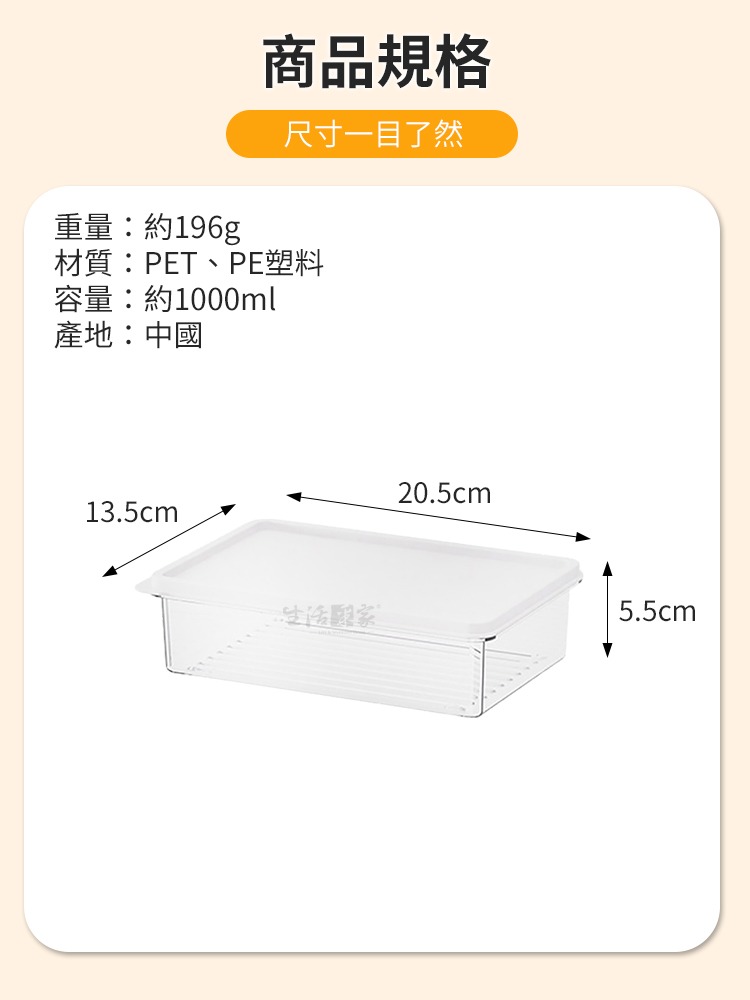 商品規格:1.尺寸:約長20.5*寬13.5*高5.5cm2.材質:PET、PE塑料3.容量:1000ml4.重量:約196g/入5.產地:中國6.耐溫:-40℃~60℃7.商品:冷凍冷藏食材分裝疊加保鮮盒1000ml*1※商品為人工丈量略有誤差,請以實品為準。※網頁圖片因拍攝關係或螢幕設定不同而會與實際商品略有色差,請以實際收到商品為準。