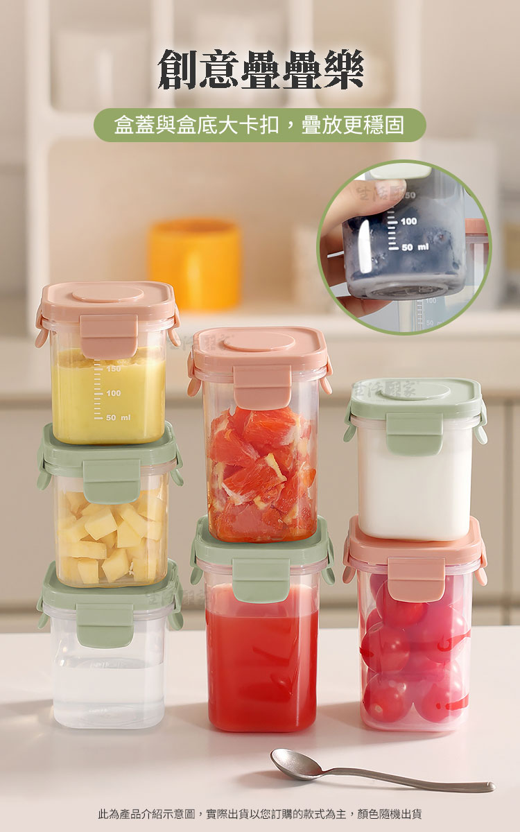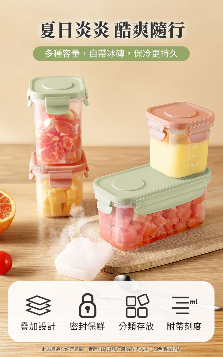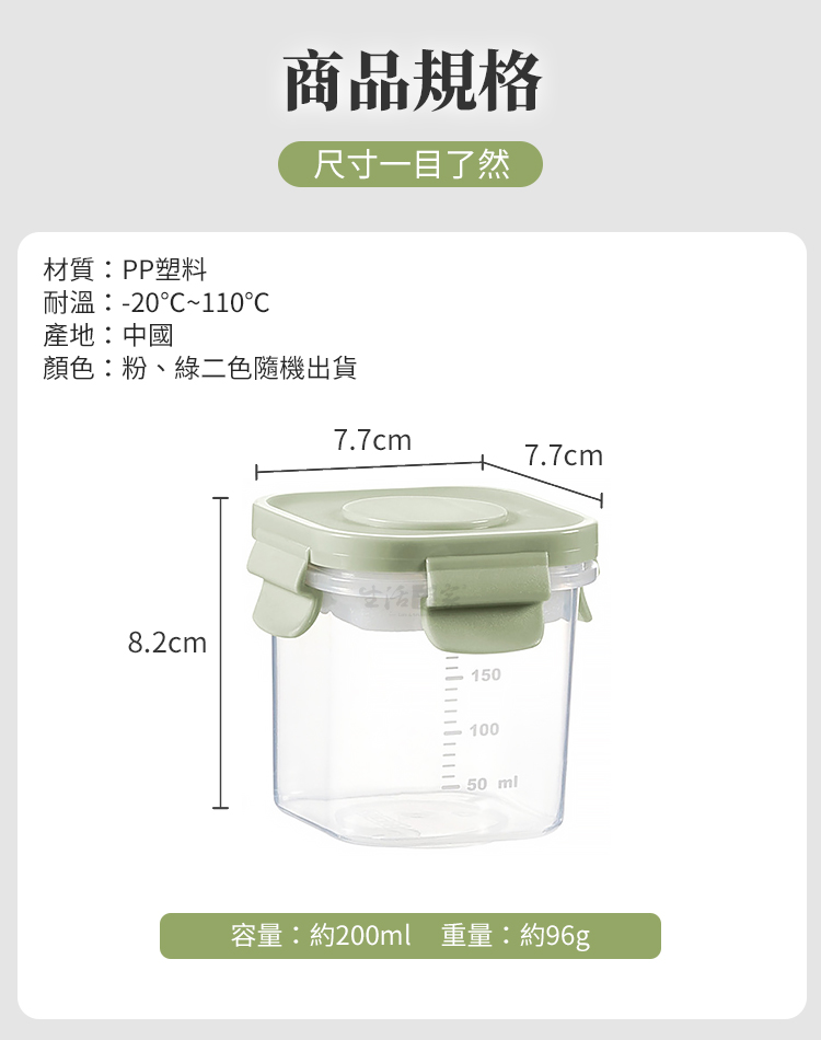 商品規格:-自帶冰磚密封保鮮罐200ml-1.尺寸:約W7.7*L7.7*H8.2cm2.材質:本體-PP塑料、密封圈-矽膠3.耐溫:-20℃~110℃4.容量:約200ml5.重量:約96g/個6.產地:中國7.顏色:綠、粉二色隨機出貨8.適用:冷凍、冷藏、微波(需取下上蓋及冰磚)-自帶冰磚密封保鮮罐300ml-1.尺寸:約W7.7*L7.7*H11cm2.材質:本體-PP塑料、密封圈-矽膠3.耐溫:-20℃~110℃4.容量:約300ml5.重量:約105g/個6.產地:中國7.顏色:綠、粉二色隨機出貨8.適用:冷凍、冷藏、微波(需取下上蓋及冰磚)-自帶冰磚密封保鮮罐500ml-1.尺寸:約16.2W*L7.7*H8.2cm2.材質:本體-PP塑料、密封圈-矽膠3.耐溫:-20℃~110℃4.容量:500ml5.重量:約212g/個6.產地:中國7.顏色:綠、粉二色隨機出貨8.適用:冷凍、冷藏、微波(需取下上蓋及冰磚)※商品為人工丈量略有誤差,請以實品為準。※網頁圖片因拍攝關係或螢幕設定不同而會與實際商品略有色差,請以實際收到商品為準。
