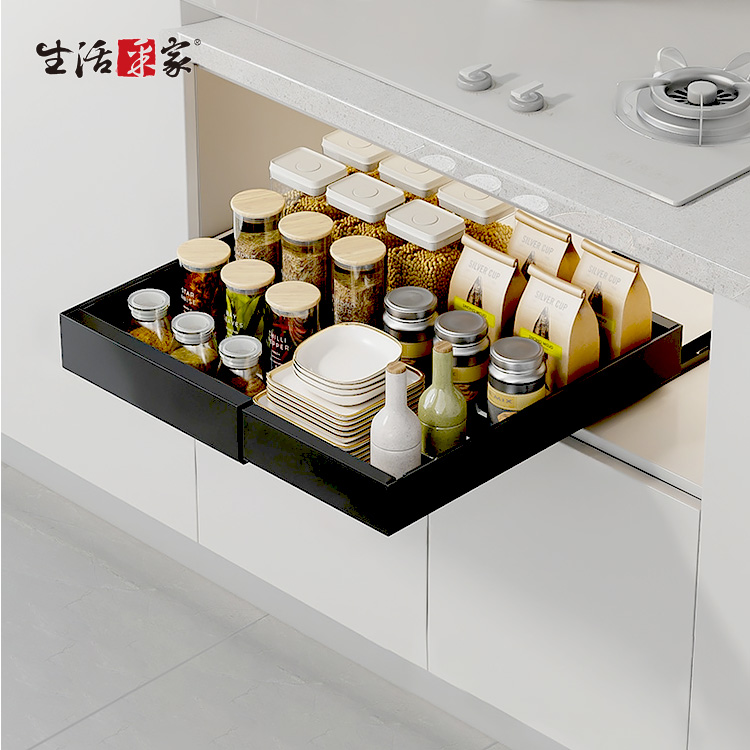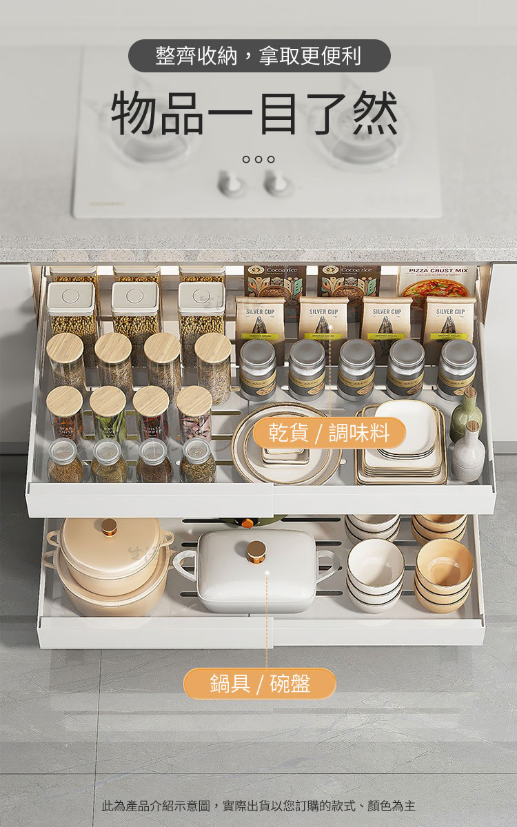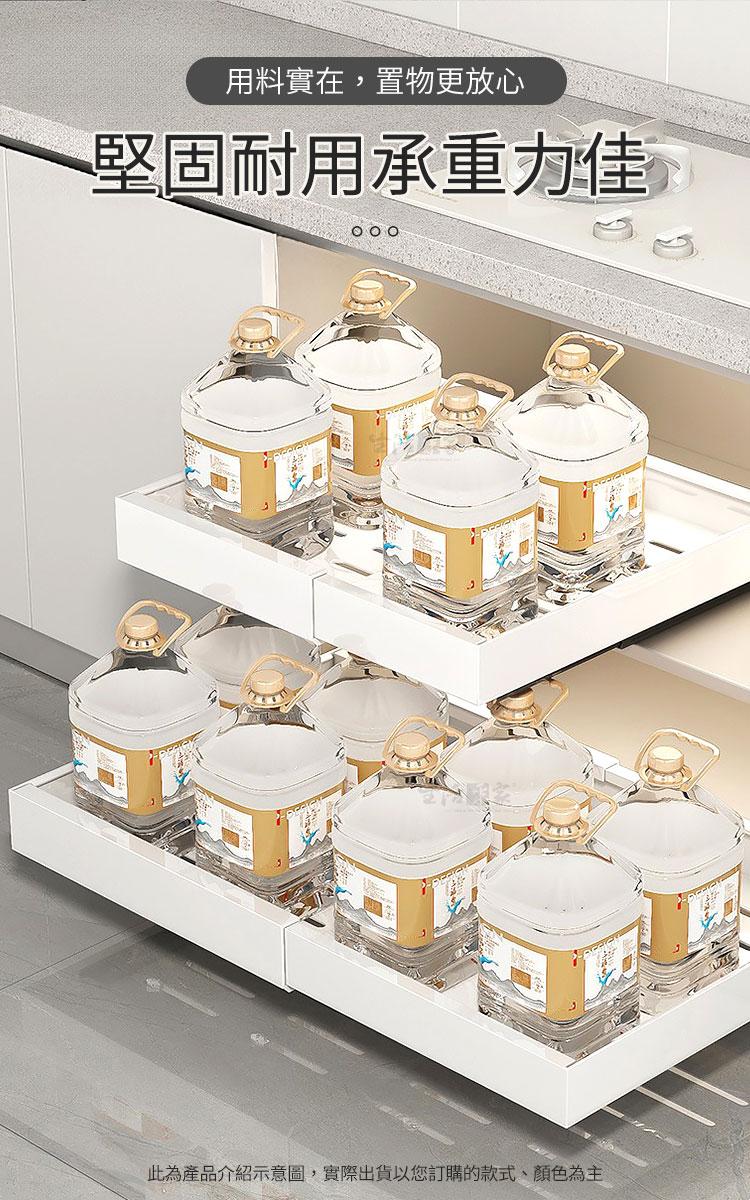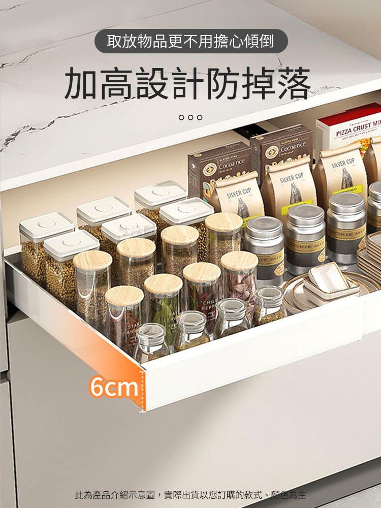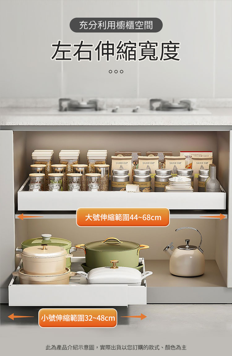 左右伸縮調節設計,讓你輕鬆調整寬度,完美適應不同櫥櫃空間,再也不用為了找不到剛剛好的尺寸而煩惱了。還有最貼心的邊檔設計,瓶瓶罐罐也不易掉落;輕輕一拉無論是油鹽醬醋還是鍋碗杯盤,通通「一目了然」,拿取超級方便!👏💪