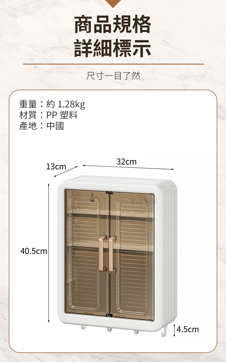 #免打孔 #防潮防塵 #輕奢家居 #收納好物 #空間收納注意事項:1.請勿重摔或高處掉落,以免商品受損。2.請勿接近高溫或勿近火源處,以免商品受損。3.商品情境圖片僅供參考,實際出貨不含週邊道具及配件。4.購買前請先量測使用區域尺寸,確定無誤再購買以免尺寸不合,敬請謹慎選購。商品規格:1.展開尺寸:約寬32*深13*高40.5cm2.折疊尺寸:約寬32*深6*高40.5cm3.貼片尺寸:6.8*6.8cm4.材質:PP塑料5.重量:約1.28kg/組6.產地:中國7.商品:免打孔壁掛防塵雙開門三層收納置物架*1、貼片*3※商品為人工丈量略有誤差,請以實品為準。※網頁圖片因拍攝關係或螢幕設定不同而會與實際商品略有色差,請以實際收到商品為準。