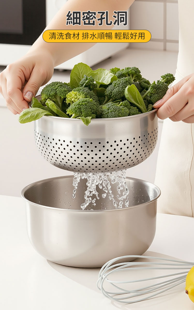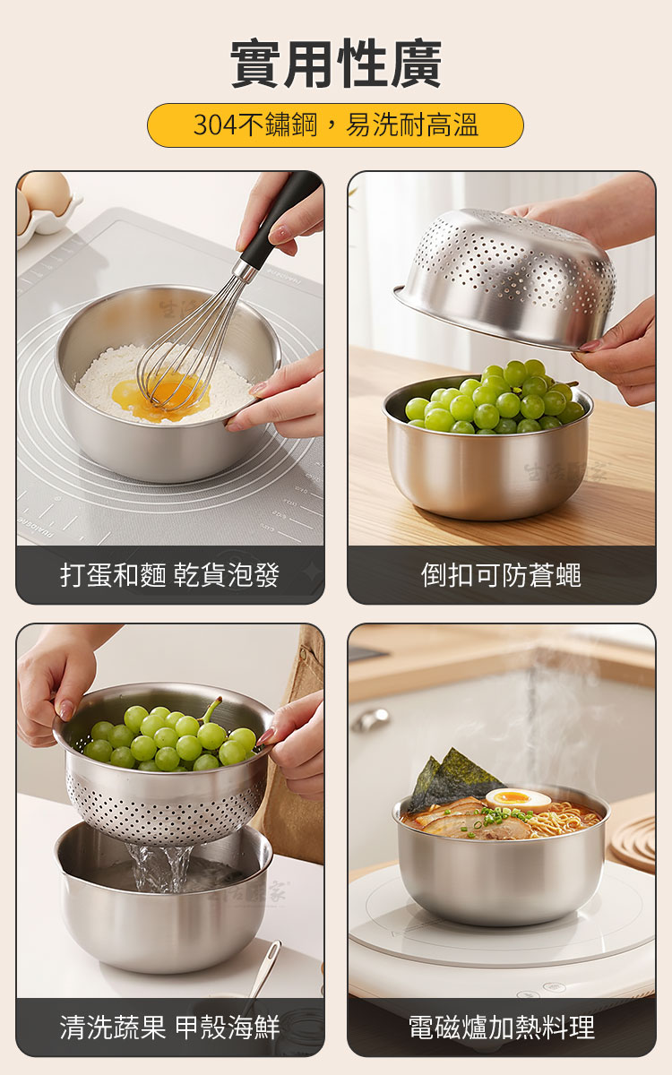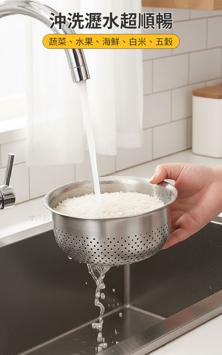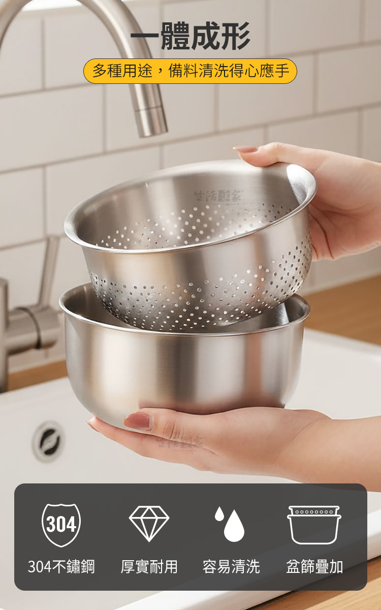 廚房備料的終極方案|生活采家 304不鏽鋼分離式瀝水清洗盆組你是否也曾為了洗菜、瀝水、備料,讓廚房檯面擺滿了大大小小的塑膠盆?傳統塑膠盆容易卡油垢、不耐高溫且難以徹底清潔。生活采家 分離式瀝水清洗盆組 為簡約生活而生,將「洗滌、濾水、盛裝、加熱」完美結合,讓你的料理過程從容不迫。✅ 頂級304不鏽鋼:食品級材質,耐腐蝕、抗氧化,告別塑膠微粒風險。🛡️✅ 細密過濾孔洞:精密排水設計,無論是白米、五穀還是細小蔬菜,都能順暢排水不掉落。💧✅ 獨家導流嘴與刻度:清洗盆附帶容量刻度與導流嘴,精準掌控備料量,傾倒蛋液或湯汁更流暢。⚖️✅ 電磁爐直接加熱:底部平整設計,不只是盆,更是鍋!洗淨後可直接置於電磁爐加熱料理,效率加倍。🔥✅ 雙層防回流間距:底部5mm加高設計,確保瀝出的水不再浸泡食材,保持蔬果清脆鮮甜。🥦👉使用後你會發現...✔️ 洗米時不再擔心米粒流失,備料後的清潔變得異常簡單。✔️ 一盆多用減少了洗碗量,廚房抽屜騰出了更多空間。✔️ 質感拉絲的金屬光澤,讓備料過程也變成一種視覺享受。🛒 生活職人的專業選擇~別讓繁雜的廚具磨滅你的料理熱情。這不只是一組洗菜盆,更是提升生活品質的投資。現在就升級你的廚房標配,體驗職人等級的流暢感!#不鏽鋼洗菜籃 #廚房備料好物 #304不鏽鋼盆 #一物多用 #生活采家📣 FAQ (常見問答)Q1:這款清洗盆可以用在瓦斯爐上嗎?A1:外盆底部平整,主要針對電磁爐、黑金爐優化,建議使用於平面發熱源。若用於瓦斯爐請確保火苗不超過盆底,以免產生焦痕,瀝水盆不建議直接加熱使用。Q2:細密孔洞會卡米粒嗎?A2:孔洞經精密設計2mm,適合清洗白米、雜糧等穀物,排水順暢且不易嵌卡,清潔十分方便。Q3:不鏽鋼盆內部的刻度會消失嗎?A3:內部刻度採用先進蝕刻工藝,耐磨損且清晰可見,即使長時間使用也不易消失。Q4:瀝水籃跟外盆疊合後容易卡住嗎?A4:我們特別設計了邊緣弧度,疊合時穩固,提取時順暢,且兩者間保有5mm間隙,排水更徹底。Q5:可以進洗碗機清洗嗎?A5:完全可以!304不鏽鋼材質堅韌耐用,完全兼容洗碗機與烘碗機。注意事項:1.初次使用,請使用中性洗潔劑清潔,也可用白醋加水煮沸一次,去除製作過程可能留下的異味。2.禁止微波,本產品為金屬材質,絕對不可放入微波爐中使用。3.避免刮傷,清洗時建議使用海綿或軟質布,避免使用鋼刷以免破壞表面金屬質感。4.加熱提醒,在電磁爐加熱時,盆身導熱極快,拿取時請務必使用隔熱手套以防燙傷。5.避免空燒,嚴禁在無盛裝任何液體或食物的情況下空燒盆體。