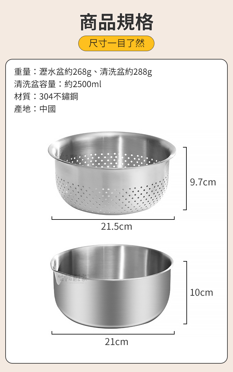商品規格:1.尺寸:約直徑21.5*高10.5cm2.材質:304不鏽鋼3.容量:約2500ml4.重量:約556g/組5.產地:中國6.商品:瀝水籃*1、清洗盆*1※商品為人工丈量略有誤差,請以實品為準。※網頁圖片因拍攝關係或螢幕設定不同而會與實際商品略有色差,請以實際收到商品為準。