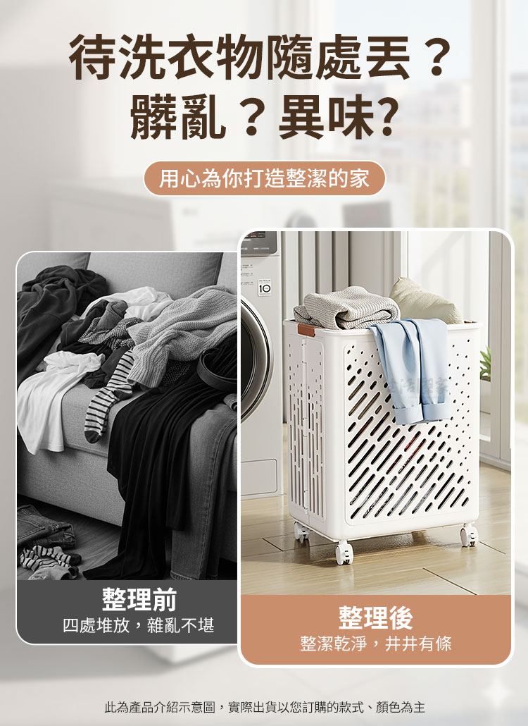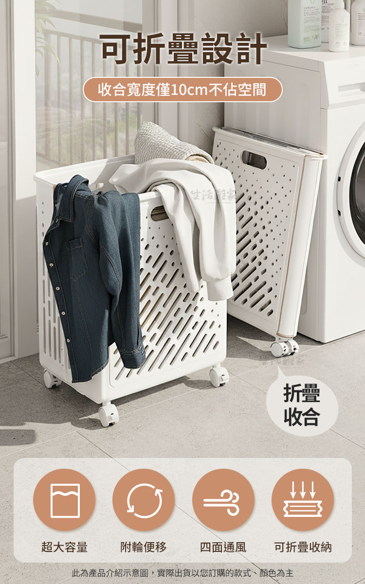 折疊收納髒衣籃,讓家一秒回到整潔狀態 🏠✨每天回家,外套、運動服、孩子的衣服是不是總是隨手一放就成堆?待洗衣物混亂堆積,不只影響視覺,更容易產生悶臭、潮濕、細菌孳生的問題。生活采家 折疊收納髒衣籃洗衣籃,正是為現代家庭、小坪數空間與高頻洗衣需求而生。✅ 可折疊設計|收合僅約10cm不用時可折疊收納,輕鬆塞進洗衣機旁、牆角或櫃縫,小空間也能大利用。✅ 四面通風孔|告別悶臭異味全籃透氣孔設計,讓衣物自然通風,不易發霉、不悶臭,特別適合台灣潮濕氣候。✅ 大開口+超大容量衣物、毛巾、床單、孩子衣服一次裝,不再來回分裝,洗衣動線更順暢。✅ 萬向滑輪|推拉超省力滿籃衣物也能輕鬆移動,從房間到洗衣間,一推就走,不傷腰不費力。✅ 厚實材質|可坐可壓不變形高承重結構設計,穩固耐用,不易塌陷,長期使用也安心。👉不只洗衣籃,更是全家收納籃你會發現,它不只拿來放髒衣服👇👕 衣物收納/分類洗衣🧸 玩具玩偶收納,培養孩子整理習慣🏀 運動用品、球具、長型物品🍼 嬰幼兒衣物、毛巾分類一籃多用,真正提升生活效率。組裝簡單,新手也會 👍商品需自行組裝,但僅需 6 個步驟,無工具、無技巧,照圖操作即可完成。為什麼現在就該入手?✔ 空間越小,越需要會折疊的收納✔ 潮濕氣候,通風比好看更重要✔ 一籃多用,比買三個收納箱更划算這不是多一個收納品,而是讓家每天都維持「剛整理好」的狀態。👉 現在入手,讓洗衣這件事,變得更輕鬆。#居家收納 #洗衣籃推薦 #折疊收納 #小坪數必備 #生活采家📣 FAQ (常見問答)Q1:這款收納籃摺疊後真的很省空間嗎?A1:是的!摺疊後寬度僅約 10 公分,非常適合放入洗衣機旁、冰箱縫隙或門後空間,是小坪數家庭的首選。Q2:裝滿濕重的衣物會不會推不動或輪子壞掉?A2:產品採用加厚高強度材質與耐重萬向滑輪設計,結構穩固,即使裝滿衣物也能流暢推行。Q3:除了當洗衣籃,還有其他用途嗎?A3:非常多功!它的大容量與透氣性,非常適合用來收納小孩的填充玩偶、瑜珈墊、球拍等運動用品,甚至可作為後車箱收納籃。Q4:組裝會很困難嗎?需要準備螺絲起子嗎?A4:完全不需要工具!只需簡單的展開、固定側邊片、放入底板並扣上滑輪,簡單六步驟即可完成,長輩也能輕鬆操作。Q5:材質容易發霉或產生異味嗎?A5:本產品採用優質塑料材質,且四面均有大面積通風孔設計,能有效維持空氣流通,減少衣物悶臭與霉味產生。注意事項:1.請勿放置於高溫曝曬處或靠近火源,避免材質變形。2.移動時請確認地面無大型障礙物,以確保萬向輪滑動順暢。3.安裝底板時請確實壓至底部,並確認側邊固定片已滑至中心鎖定,以維持結構穩定。4.清洗時建議使用中性清潔劑搭配濕布擦拭,請勿使用具腐蝕性之化學藥劑。商品規格:1.展開尺寸:寬38*深36*高49cm2.折疊尺寸:寬38*深10*高49cm3.容量:約50公升 4.材質:PP塑料5.重量:約1268g/組6.顏色:經典白7.產地:中國※商品為人工丈量略有誤差,請以實品為準。※網頁圖片因拍攝關係或螢幕設定不同而會與實際商品略有色差,請以實際收到商品為準。
