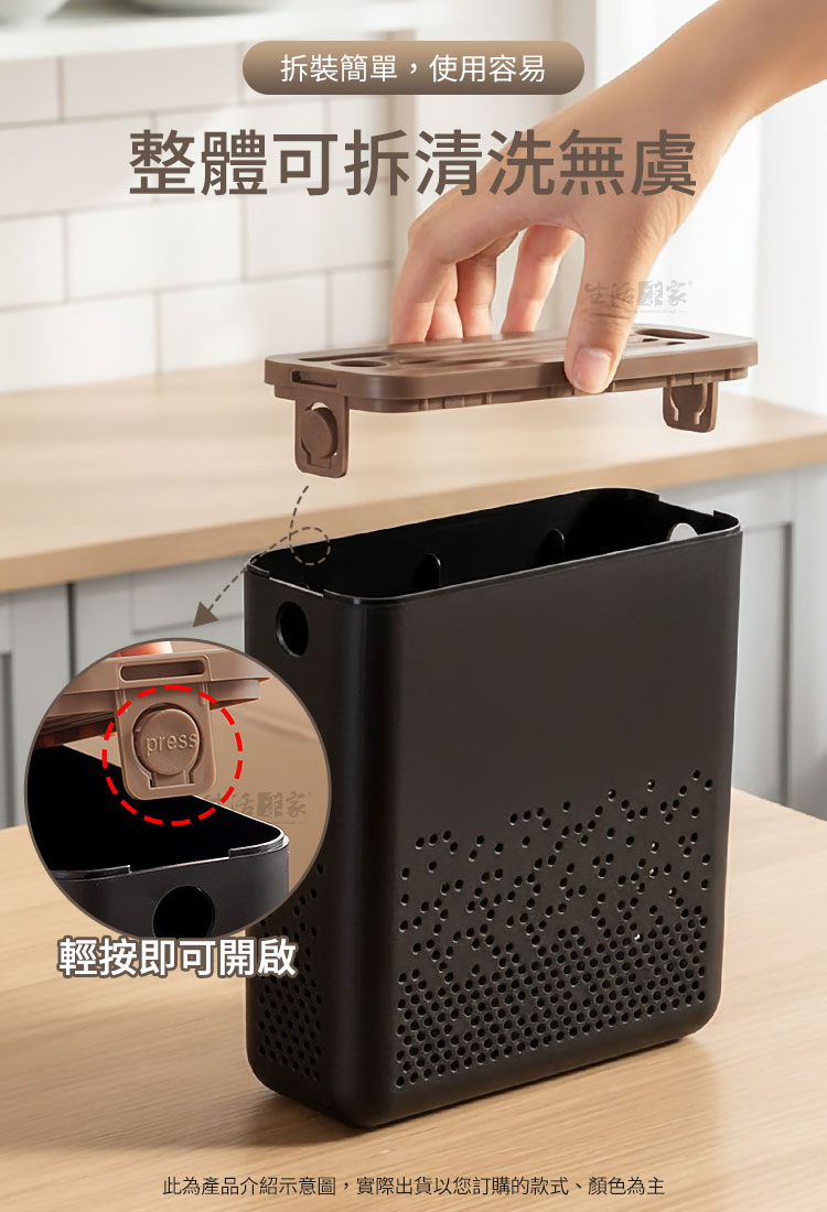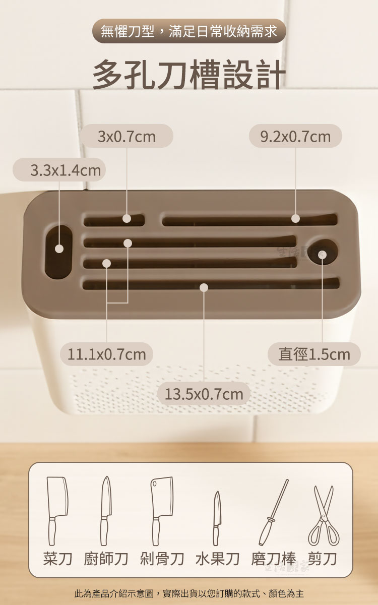 告別濕黏廚房︱生活采家︱免打孔壁掛式刀具瀝水收納架 ✨ 乾淨・高效・美學你的廚房需要「懸浮式收納」革命:免打孔、強承重、全方位防霉!廚房好物大推~你是否厭倦了廚房檯面上,濕漉漉又佔空間的傳統刀座?或是容易生鏽的刀架?潮濕的環境不僅容易滋生細菌,更會讓心愛的刀具髒污、發霉,影響家人健康?別再讓「髒污」和「擁擠」成為你下廚的阻力! 生活采家為您帶來革命性的「免打孔壁掛刀具架」,這不僅是一個收納工具,更是您打造乾淨、高效、輕奢廚房的關鍵升級!🔨 免打孔安裝,租屋族最愛! ( 無痕收納)告別牆面鑽孔破壞!採用超強黏貼技術,5KG 強悍承重力,安裝極簡、穩固不掉落。完美適用於磁磚、玻璃等光滑牆面。🌬️ 360°全方位通風透氣設計 ( 抗菌防霉)主體外殼及刀槽內膽均設計密集瀝水孔洞,確保刀具、剪刀能迅速風乾,杜絕水漬殘留,確保刀具衛生,延長使用壽命。🧼 整體可拆清,衛生無死角! ( 易潔設計)可拆卸瀝水內桶與頂部刀槽蓋設計,輕按即可開啟、取出。每一個組件都能單獨沖洗,真正做到不藏污納垢,告別傳統刀座難以清潔的衛生死角。📏 多孔刀槽分格,收納更專業! ( 多功能分類)多尺寸刀槽設計,從中式菜刀、主廚刀、剔骨刀、水果刀、磨刀棒到廚房剪刀,全部都能分門別類、安全插放。滿足您日常所有刀具的收納需求,專業俐落。🔄 靈活兩用,自由選擇擺放! (空間優化)無論是壁掛收納釋放寶貴台面空間,還是面收納隨時取用,都能完美適應。時尚的黑白雙色,輕鬆融入輕奢、極簡、北歐等各種廚房風格。💡 使用後你會發現...當您裝上這款刀具架,您會立即感受到廚房檯面彷彿被魔法淨化!髒污消失了,雜亂不見了,每一次取用刀具都變得乾淨俐落、安心無憂。它不只是收納,它是對您和家人飲食衛生的一份承諾升級。讓下廚成為一種享受,而不是一場清理的戰鬥!🔔 限時搶購,輕鬆擁有整潔廚房!✨ 選擇經典 「輕奢黑」 或優雅 「奶油白」,讓您的廚房立即升級! 🎁 現在就行動,別讓等待增加廚房的潮濕與凌亂。現在下單,即刻享受乾淨、清爽的烹飪環境!#生活采家 #免打孔刀具架 #廚房收納好物 #瀝水刀座 #壁掛式收納📣 FAQ 常見問答Q1:免打孔真的能牢固嗎?A1:可!採用強力背膠固定設計,經測試可承重4~5公斤,不易掉落。Q2:適用在哪些牆面?A2:建議使用於光滑牆面如磁磚、不鏽鋼、玻璃等。粗糙牆面或粉刷牆不建議使用。Q3:刀具架可放幾支刀?A3:共有多孔槽位,可放置約6~8支刀具+剪刀。Q4:清洗是否方便?A4:上蓋與內桶可完全拆卸,流水沖洗即可清潔乾淨,不藏污垢。Q5:可以改掛其他廚具嗎?A5:沒辦法哦,刀槽設計只能放刀具,無法放置其它廚具物品。注意事項:1.免打孔安裝僅適用於光滑、平整、無油污、無粉塵的表面,例如:光滑磁磚、大理石、玻璃、金屬板等。不適用於水泥牆、壁紙、石灰牆等粗糙或易脫落表面。2.為確保最佳承重效果,強力背膠黏貼上牆後,請務必靜置12小時後再放置刀具和重物。3.建議定期拆卸內部的瀝水桶和頂部刀槽進行沖洗,保持內部乾燥和清潔,以達到最佳的防霉抗菌效果。4.放置刀具時,請務必將刀刃朝內、刀柄朝上,確保使用安全,避免兒童誤觸或取用時造成劃傷。5. 購買前請確認您的常用刀具尺寸(尤其是刀刃厚度)是否符合產品圖所示的刀槽尺寸,並留意產品建議的承重上限。